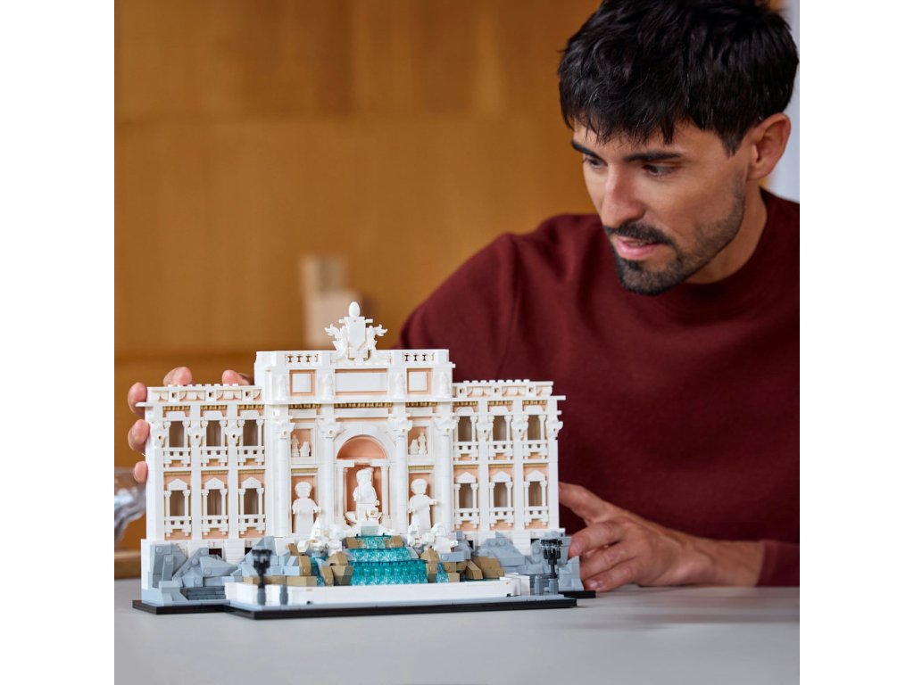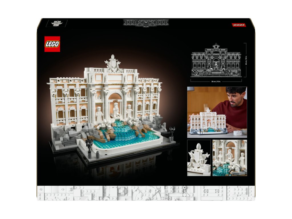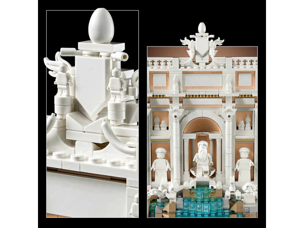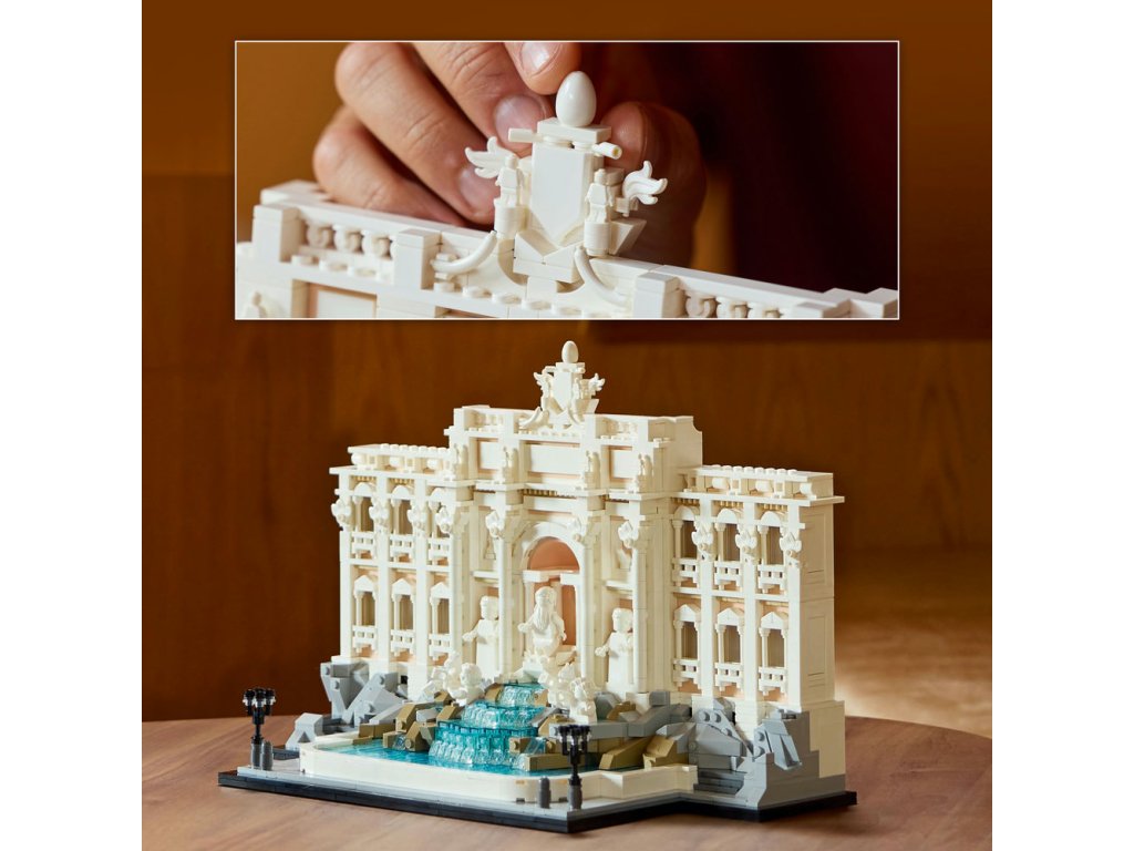 Tento tip na nostalgický darček k narodeninám či sviatkom vám počas stavania priblíži históriu aj mytológiu známej fontány. Sochy fontány sú vytvorené v podobe minifigúrok. Model bol navrhnutý tak, aby pripomínal zážitok z pohľadu na fontánu za slnečného dňa. Vyskúšajte si aktualizované staviteľské techniky a postavte autentické detaily fontány vrátane fasády paláca Palazzo Poli ako aj ikonických sôch Okeanosa v jeho voze v tvare mušle a Hojnosti a Zdravia v podobe minifigúrok. Nájdete tu aj morské koníky a Tritónov vo vode, vedľa hlavnej fontány malú „Fontánu milencov“ a ceduľku na dokončenie veľkolepého výstavného modelu Fontány di Trevi. Táto očarujúca stavebnica zo série LEGO Architecture poteší vás aj všetkých kreatívnych dospelých, ktorí obľubujú históriu, umenie, cestovanie alebo Taliansko. Stavebnica bude perfektným darčekovým predmetom z Ríma, ktorú môžete s hrdosťou podarovať akémukoľvek