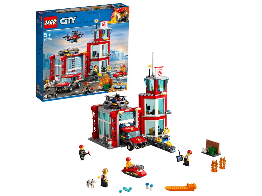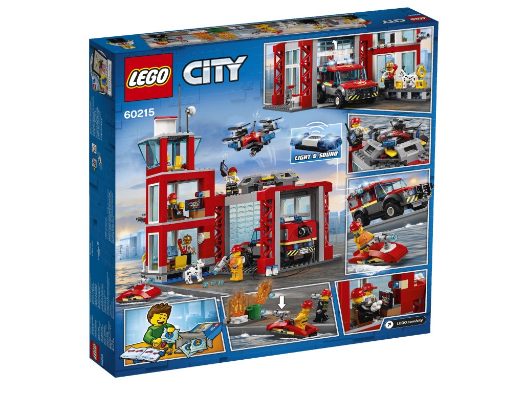 Ochráň občanov LEGO® City s akčnou stavebnicou 60215 Hasičská stanica, ktorá obsahuje trojposchodovú hasičskú stanicu s kanceláriou, relaxačnú miestnosť a vyhliadkovú vežu, malý prístav, samostatnú garáž s veľkými otváracími dverami a pristávaciu plochu pre odnímateľný hliadkovací dron s otočnými rotormi a kamerou. Táto parádna stavebnica obsahuje aj terénne vozidlo s požiarnou hadicou, ktorá strieľa vodné dieliky, funkčnú kocku so svetlom a zvukom, ktorá je novinkou pre január 2019, ako aj vodný skúter, 4 minifigúrky a psíka z požiarnej stanice.
