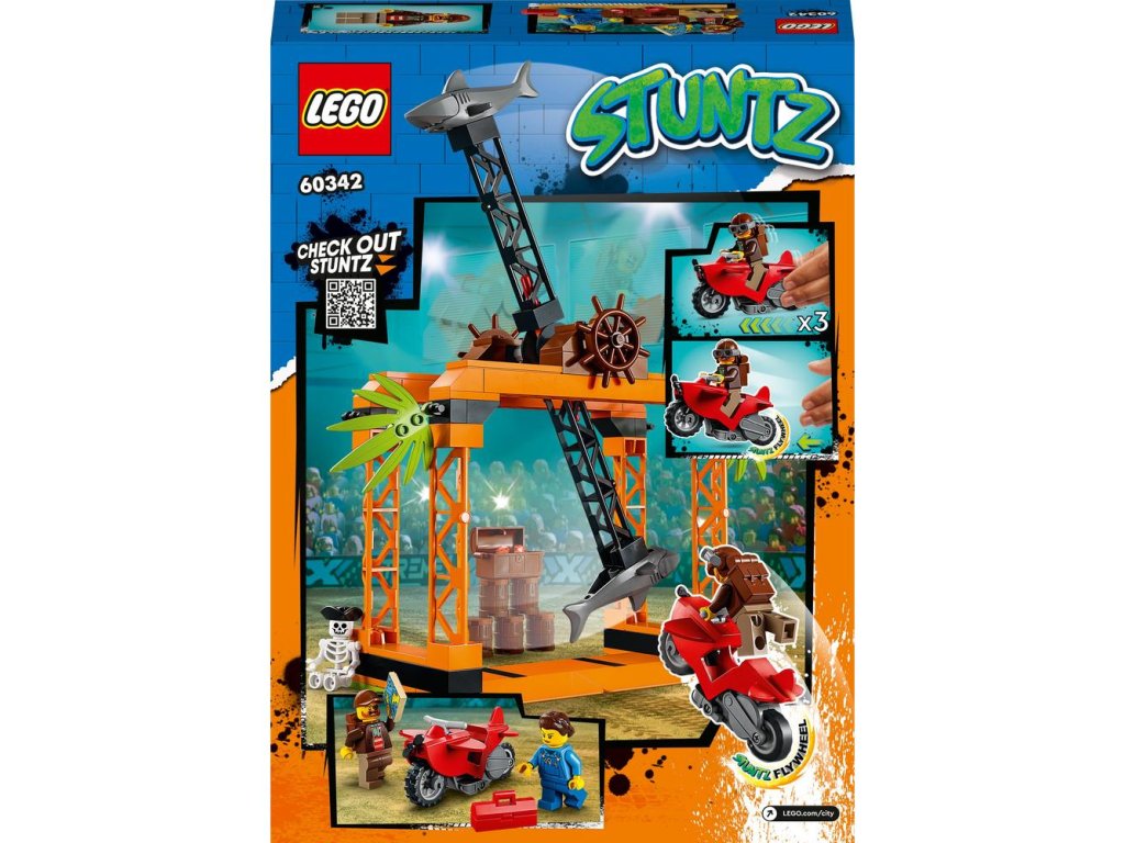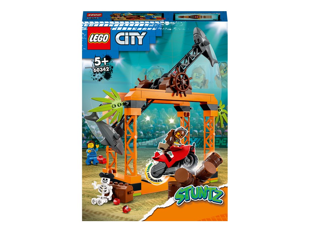 - Výzva zo série LEGO® City Stuntz so zábavnými funkciami – deti môžu stiahnuť a uvoľniť kaskadérsku motorku, nájsť sa otočnému žraločiemu kolesu, aby zasiahli sudy a odhalili pirátsku truhlicu s pokladom