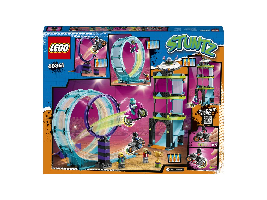 So stavebnicou LEGO® City 60361 Najbláznivejšia kaskadérska výzva vás čakajú zábavné hry plné akcie. Táto stavebnica s tromi prvkami pre deti od 7 rokov obsahuje 2 hračkárske kaskadérske motorky a 3 kombinovateľné kaskadérske zariadenia vrátane 360° slučky, ohnivého kruhu a zábavnej výzvy v mimozemskej veži. Deti si môžu otestovať svoje zručnosti, predvádzať epické predstavenia a súťažiť s rodinou a kamarátmi o víťaznú trofej. Interaktívna staviteľská zábava Hračkársky set LEGO City Stuntz sa dodáva s tlačeným návodom na stavanie a k dispozícii je aj aplikácia LEGO Builder pre smartfóny a tablety, v ktorej nájdete intuitívne nástroje na otáčanie a približovanie zobrazenia, aby si deti svoj model počas stavania dokázali lepšie predstaviť zo všetkých strán.