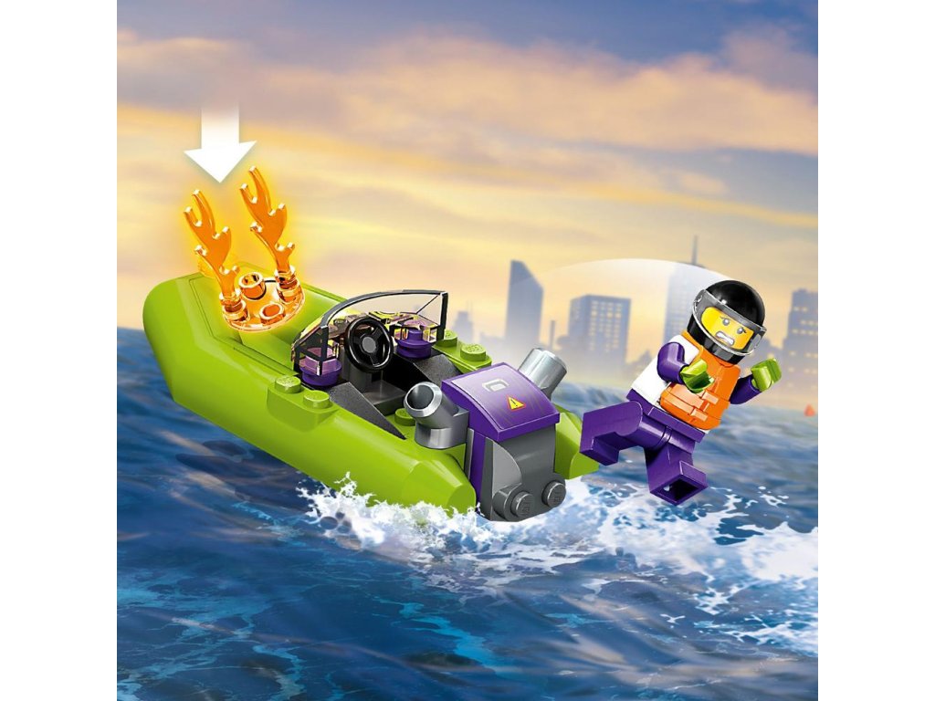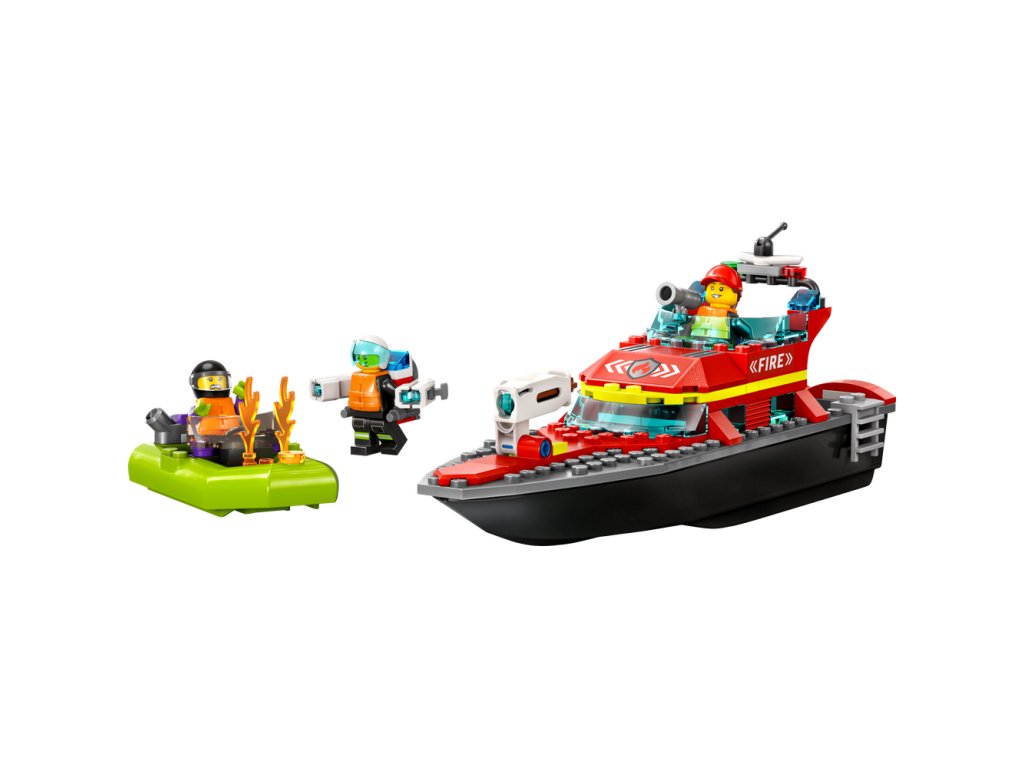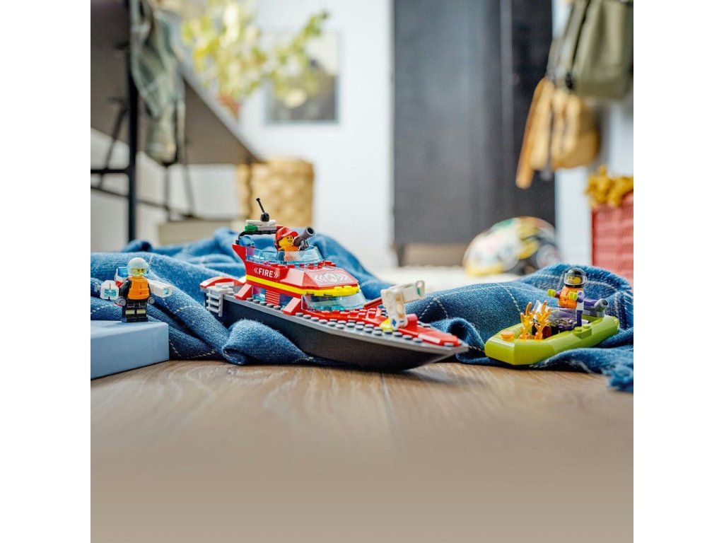 - Čo je v balení? – Všetko, čo deti potrebuje postavenie hasičskej lode a nafukovacieho motorového člna, ako aj 4 minifigúrky so zábavnými doplnkami vrátane hasiaceho tryskového batohu