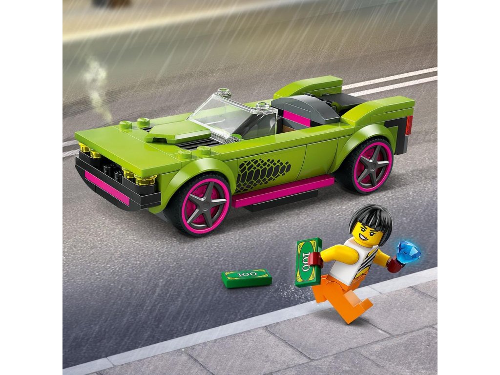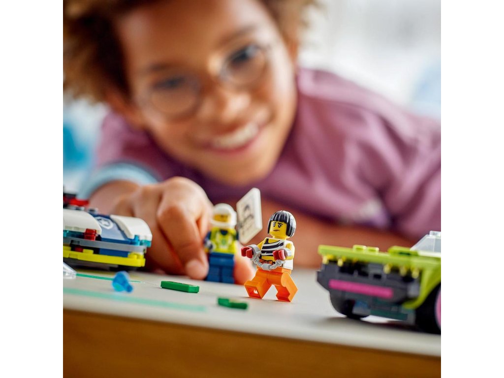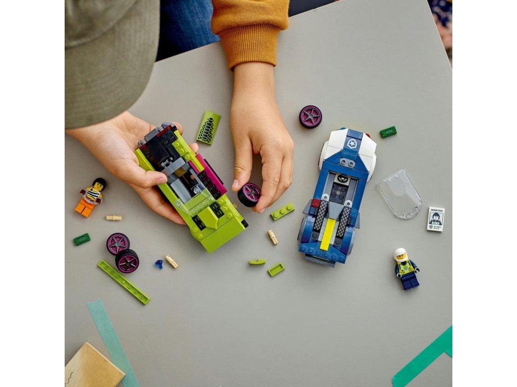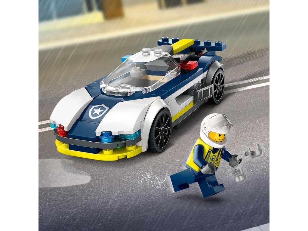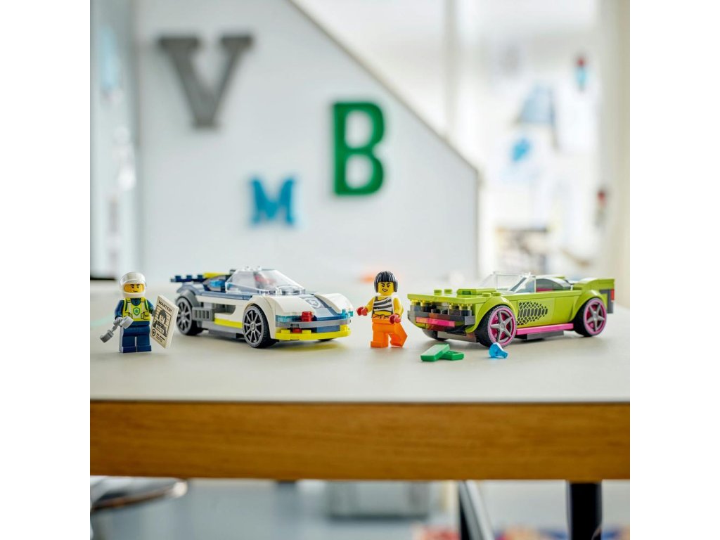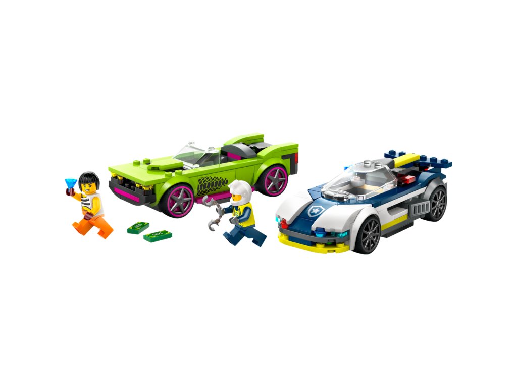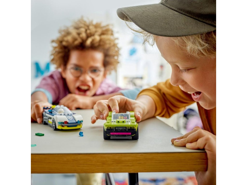Stavebnica LEGO® City Naháňačka policajného auta a športiak pre chlapcov aj dievčatá obsahuje parádne policajné zásahové vozidlo a únikové auto spolu s minifigúrkami policajta a zločinca pre zábavné hry na postavy a vymýšľanie príbehov.