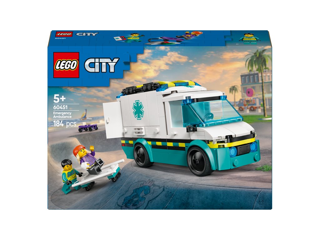 Deti od 5 rokov čakajú akčné záchranárske misie s touto hračkárskou LEGO® City Sanitkou (60451). Deti sklopia bočné panely, otvoria zadné dvere a ľahko sa dostanú k nosidlám a zdravotníckemu vybaveniu vrátane injekčnej striekačky, obväzu a lekárskej tašky. Stavebnica obsahuje aj skateboard a skate rampu, ako aj minifigúrky skateboardistu a záchranára na zábavné hry na postavy a vymýšľanie príbehov.