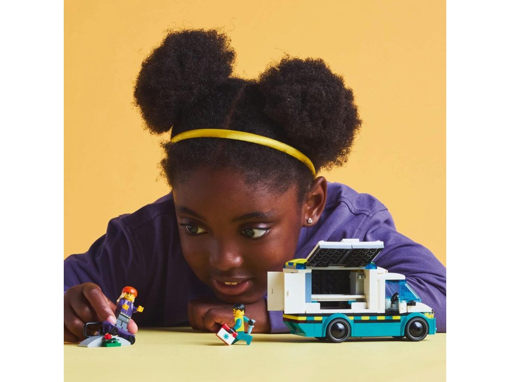 - Doplnky pre minifigúrky LEGO® – Tento model sanitky obsahuje zábavné doplnky na hry na záchranárov, ako napríklad hračkársku injekčnú striekačku LEGO, obväz a zdravotnícku tašku