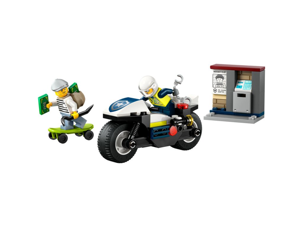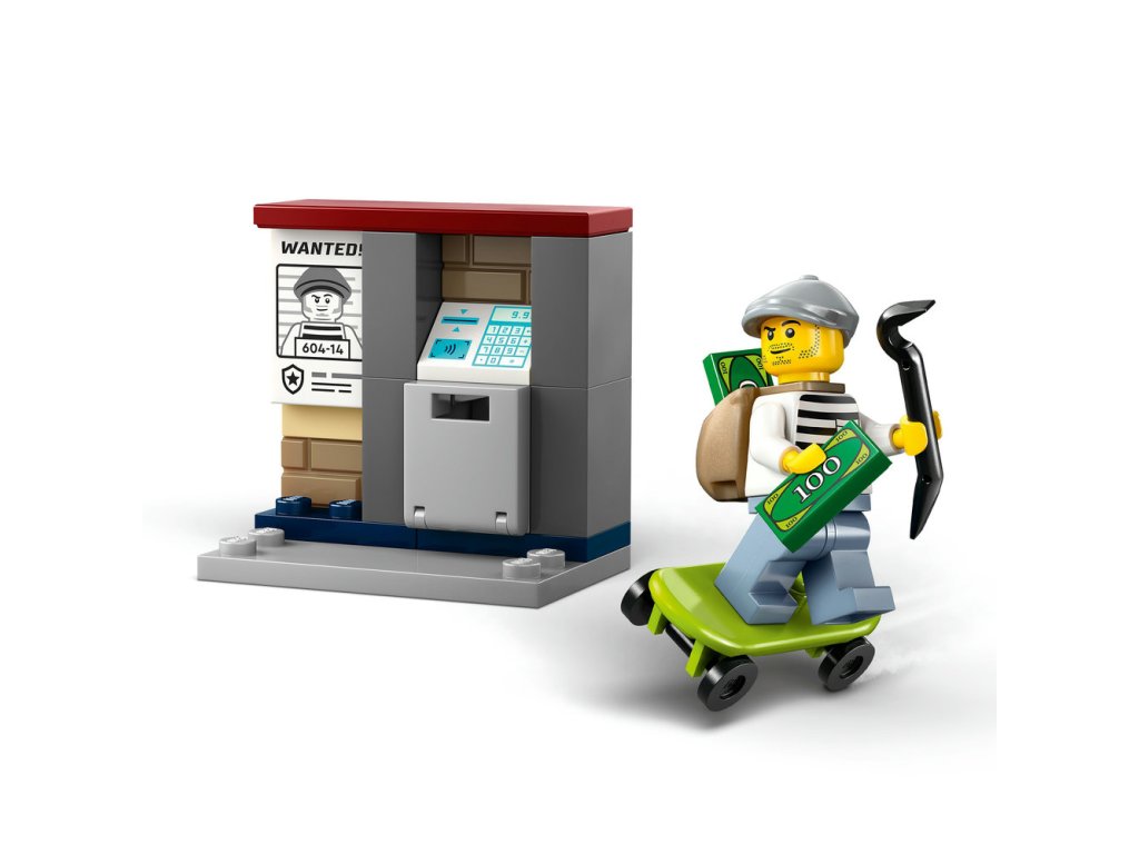 - Čo nájdete v balení? – Všetko, čo budú deti potrebovať na postavenie policajnej motorky, skateboardu a bankomatu, ako aj minifigúrky policajta a skateboardistu