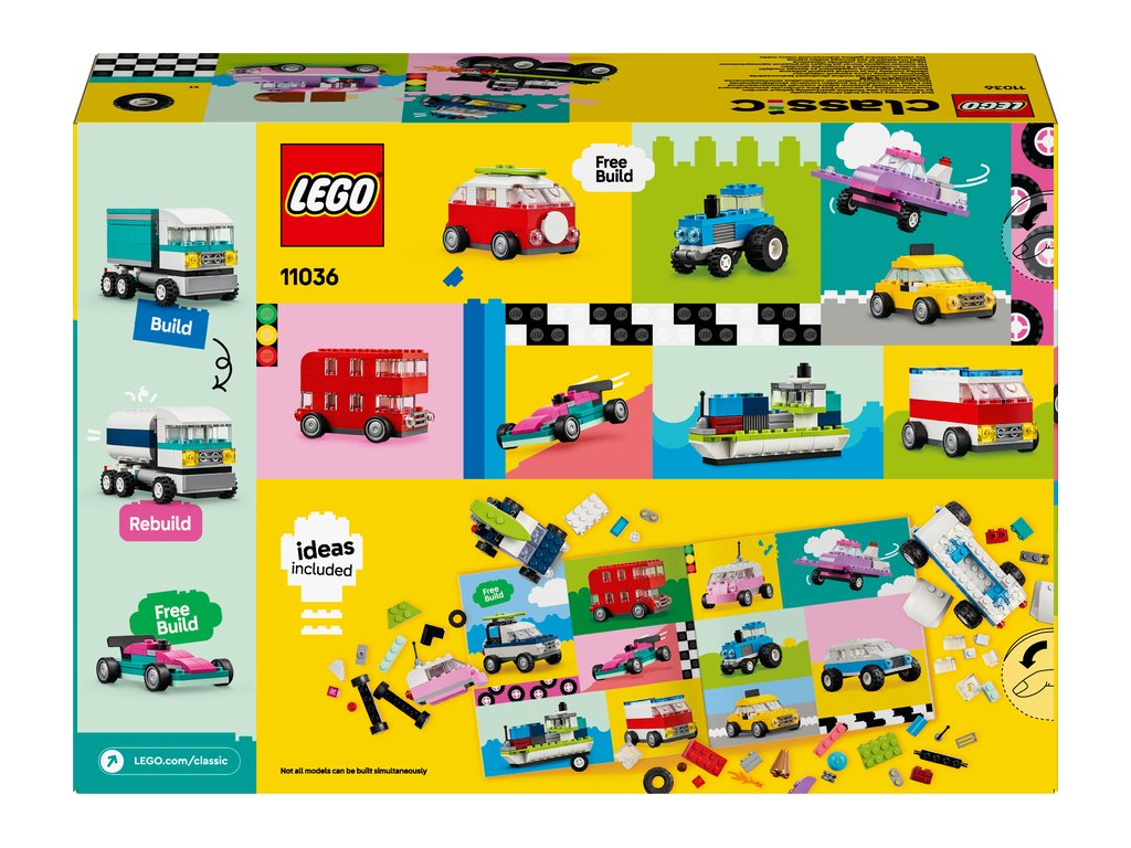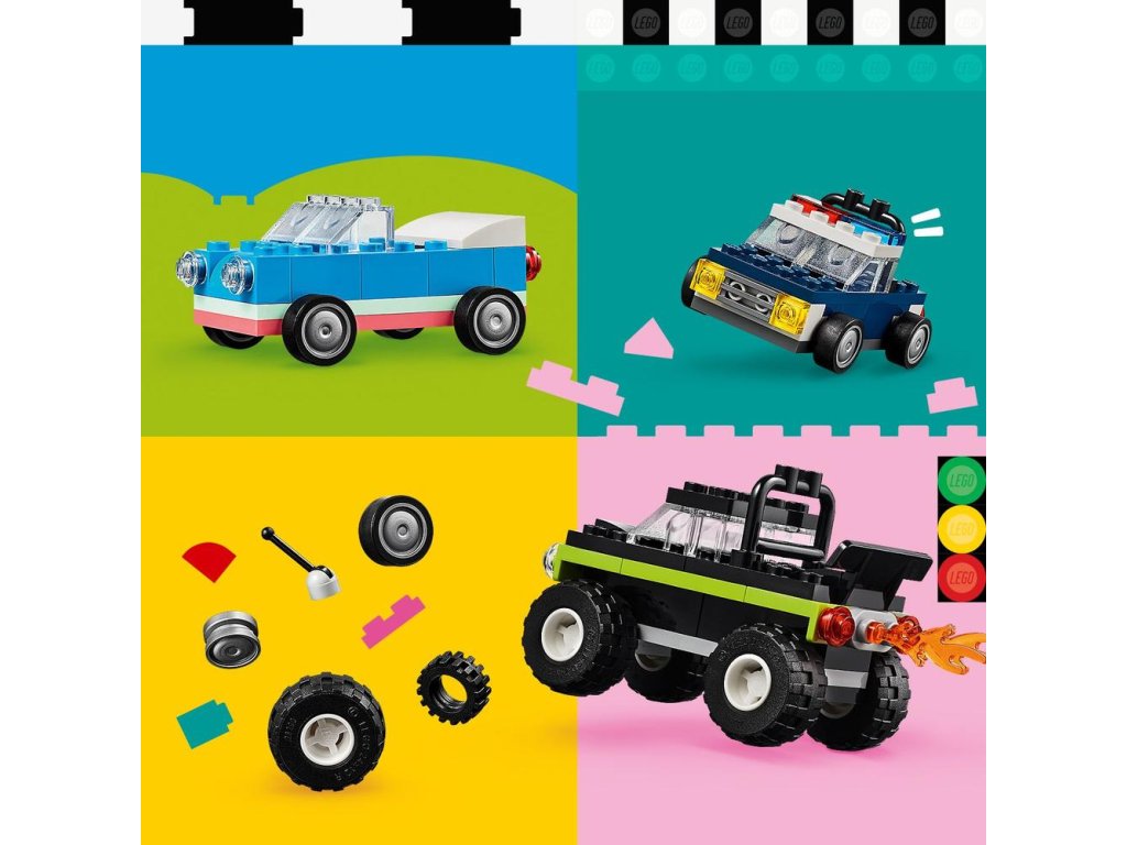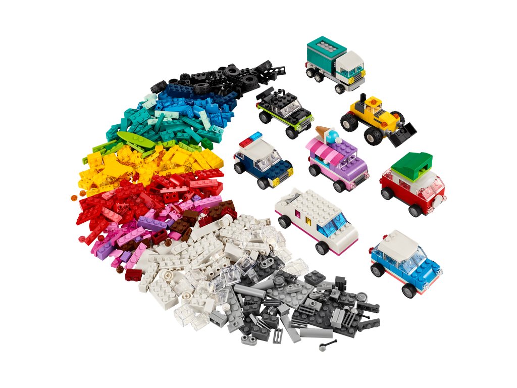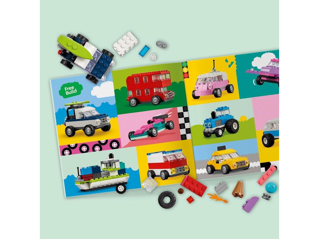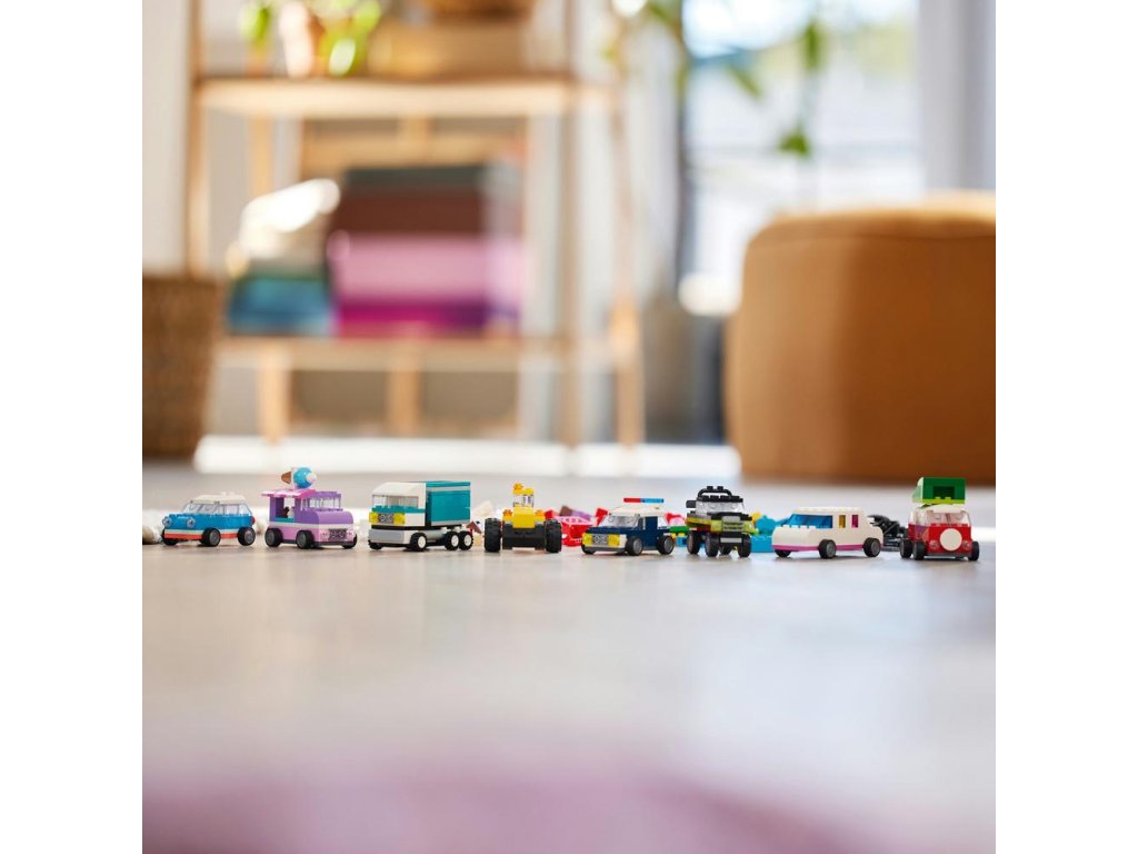 Vďaka 900 stavebným kockám, špeciálnym dielom, 52 kolieskam a jednoduchému návodu si deti môžu postaviť policajné auto, zmrzlinárske auto, ATVkolku, čelný nakladač, nákladné auto, kombi, terénne auto a hračkársku limuzínu. Potom si deti môžu prestaviť svoje vozidlá novými a zábavnými funkciami pomocou rôznych nápadov na iné vzory, parádne detaily a farebné dekorácie. Môžete otestovať svoje vlastné návrhy a rozvíjať svoje tvorivé konštrukčné zručnosti. raz je aj 10 tvorivých nápadov, ktoré štartujú zábavu popri vlastnom stavaní. Návod nájdete aj v aplikácii LEGO Builder, ktorá umožňuje deťom približovať a otáčať modely a sledovať svoj staviteľský pokrok.