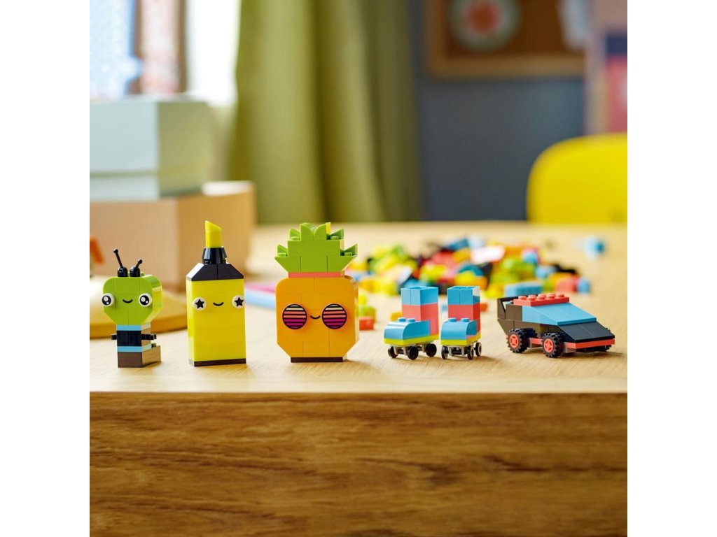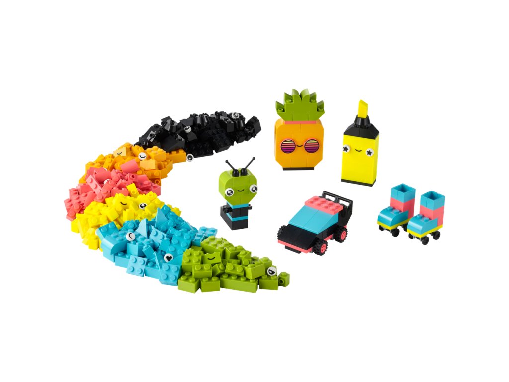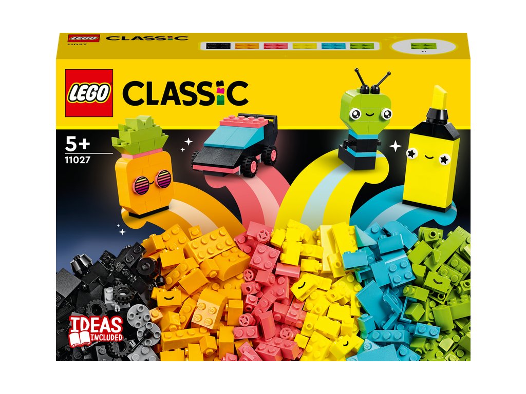 - Pestrofarebné stavebnicové kocky – Podporte záujem detí od 5 rokov o tvorivé stavanie so živou a univerzálnou stavebnicou LEGO® Classic Neónová kreatívna zábava (11027)