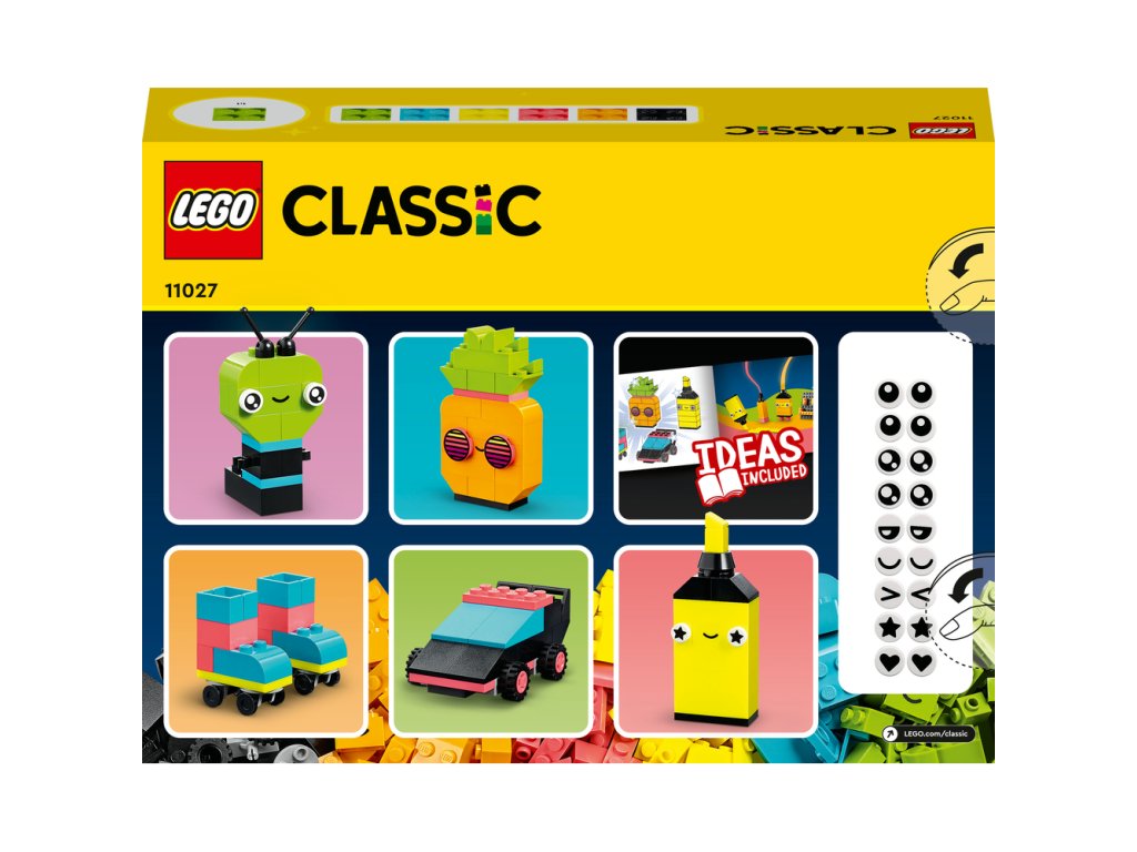 Naštartujte tvorivý rozvoj detí so stavebnicou LEGO® Classic Neónová kreatívna zábava (11027). Vďaka nápadom na jednoduché modely a zábavnému stavaniu bez obmedzení môžu začínajúci stavitelia od 5 rokov s týmto pútavým setom prejaviť záujem o umenie a dizajn. Pestro sfarbené kocky pre tvorivé deti Táto univerzálna stavebnica obsahuje 333 kociek rôznych veľkostí a žiarivých neónových farieb. 18 kociek obsahuje aj výrazné oči, ktoré detským výtvorom vdýchnu život. Súčasťou je tlačený návod napostavenie 5 zábavných modelov – ananásu, zvýrazňovača, auta, mimozemšťana a kolieskových korčúľ –, ktoré deťom dodajú tvorivé sebavedomie potrebné na postavenie všetkého, čo len chcú! V appke LEGO Builder navyše nájdete digitálnu verziu návodu na stavanie. Skvelá voľba pre celú rodinu Hračky LEGO Classic 5+ vkladajú nápady a inšpiráciu do rúk detí a dospelým ponúkajú príležitosť zabaviť sa pri stav