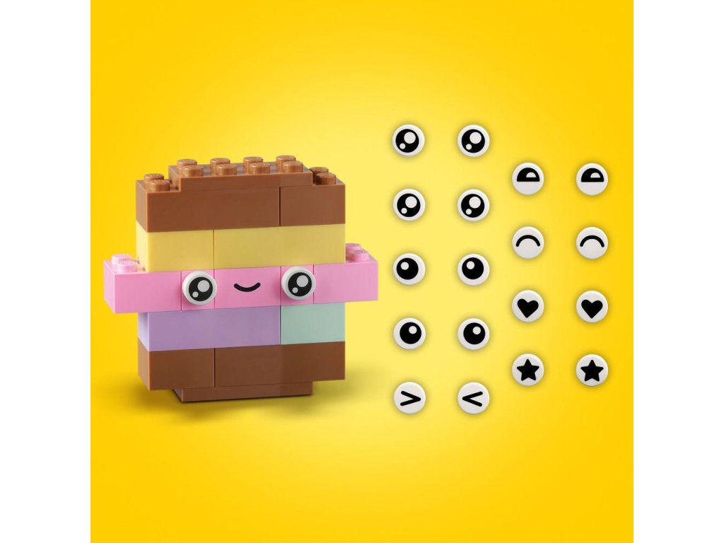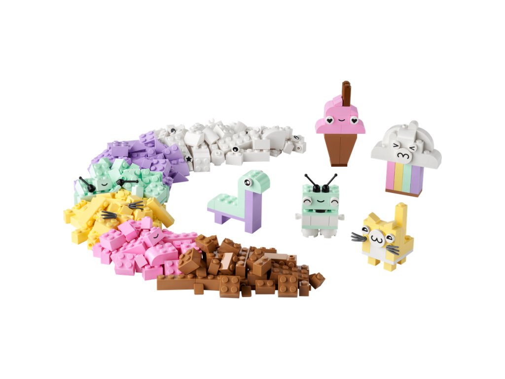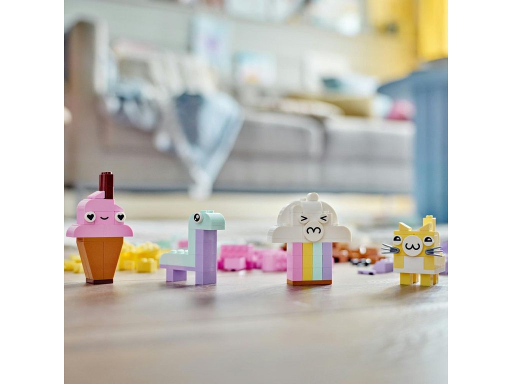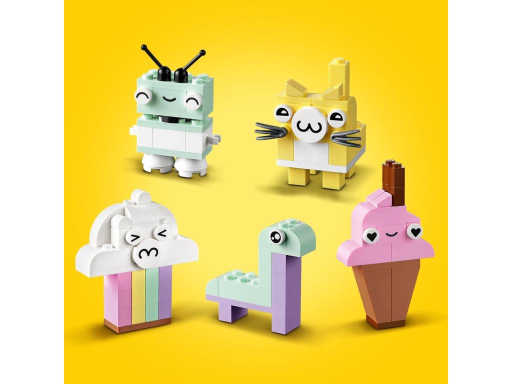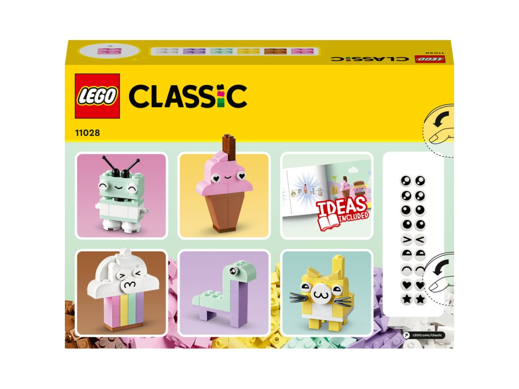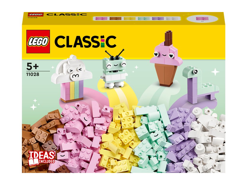 nšpirujte začínajúcich staviteľov vo veku od 5 rokov stavebnicou LEGO® Classic Pastelová kreatívna zábava (11028). Vďaka jednoduchým modelom a zábavnému stavaniu bez obmedzení táto pútavá zmes kociek prebudí záujem detí o umenie a dizajn. Tvorivé hry s pastelovými farbami Táto kreatívna stavebnica obsahuje 333 kociek rôznych tvarov, veľkostí a pastelových farieb. 18 kociek obsahuje aj výrazné oči, ktoré detským výtvorom vdýchnu život. Súčasťou je zrozumiteľný tlačený návod na postavenie 5 jednoduchých modelov: oblaku, zmrzliny, dinosaura, mačky a robota. Keď deti naberú tvorivé sebavedomie, môžu sa ponoriť do zábavného stavania bez obmedzení. V appke LEGO Builder navyše nájdete digitálnu verziu návodu na stavanie. Skvelá voľba pre celú rodinu Hračky LEGO Classic 5+ vkladajú nápady a inšpiráciu do rúk detí a dospelým ponúkajú skvelú príležitosť zabaviť sa pri stavaní a prežiť vzácne vývojové míľniky spo