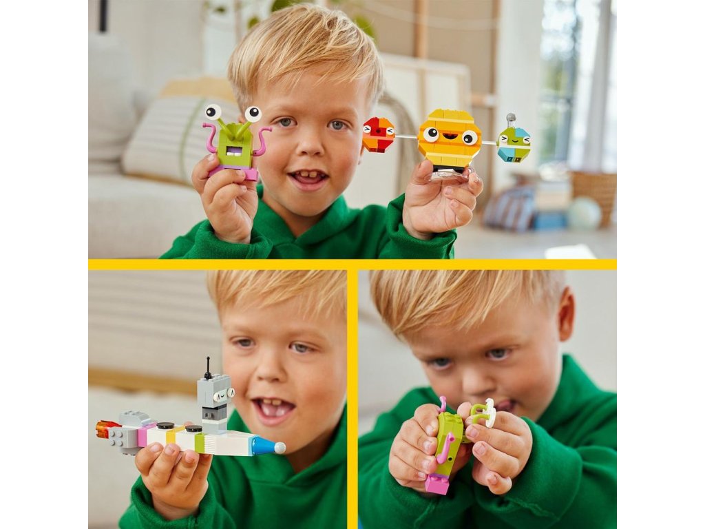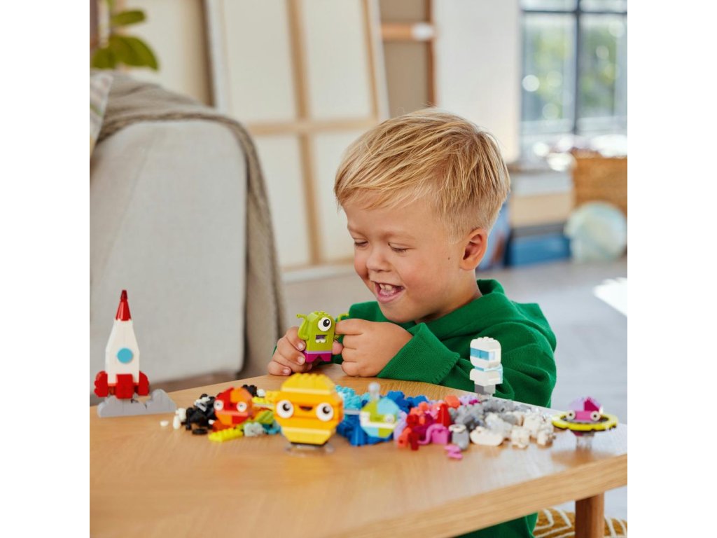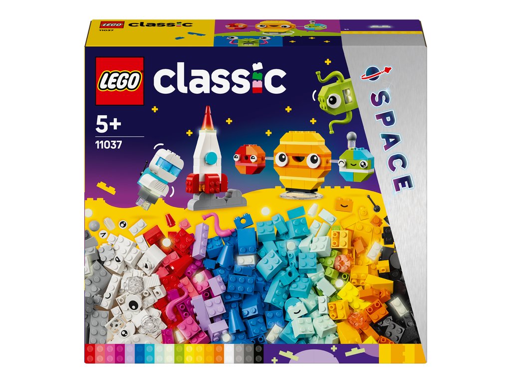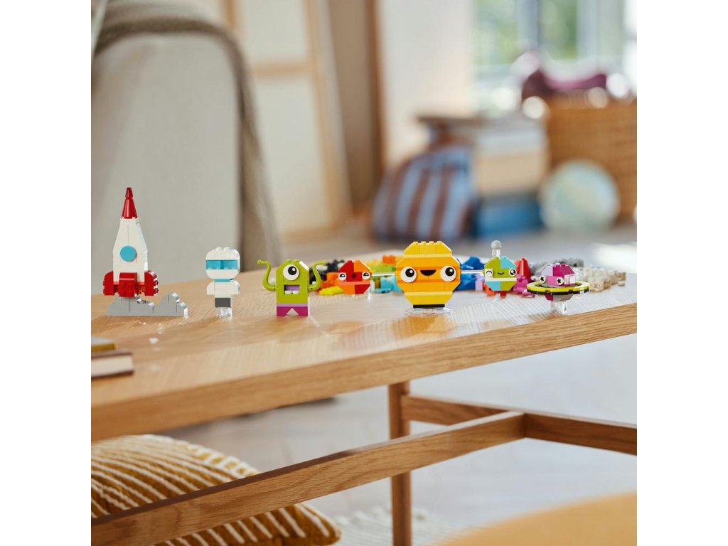 Z farebných kociek si deti môžu postaviť hračkársku kozmickú loď, mimozemšťana, astronauta a mini slnečnú sústavu vrátane Marsu, Zeme, Slnka a Saturnu s prstencami. Vesmírne modely si potom môžu prispôsobiť pomocou alternatívnych farieb, tvarov, očí, výrazov a stojanov, vďaka ktorému možno model otáčať. K dispozícii sú dokonca aj dieliky, ktoré svietia v tme a bude ich vidieť aj v noci. Vesmírna kreativita pokračuje návrhmi na alternatívne stavby vrátane kompletnej slnečnej sústavy s 8 planétami. Návod a iné digitálne funkcie sú k dispozícii aj v aplikácii LEGO Builder.