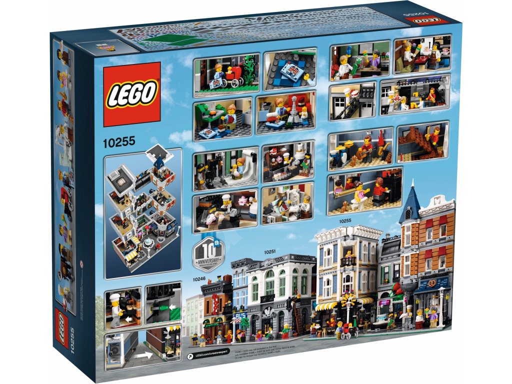 Urob si výlet na úžasné Zhromaždenie na námestí navrhnuté k desiatemu výročiu LEGO® Modulárnych budov. Táto stavebnica obsahuje množstvo neprekonateľných geniálnych detailov a tajných prekvapení. Ľahko snímateľné časti budov poskytujú prístup do dokonale prepracovaného interiéru, ktorý ukrýva v prízemí pekáreň, kvetinárstvo a kaviareň, na prvom poschodí hudobniny, fotoštúdio a zubnú ordináciu a na druhom poschodí tanečné štúdio a byt s prístupom na strešnú terasu s grilom. Exteriér budovy obsahuje detailný chodník s vonkajším nábytkom kaviarne, fontánou, pouličnými lampami a skvelo prepracovanou fasádou s krásnymi detailnými oknami a dverami, 3 zostaviteľnými ceduľami obchodov, vežou a ozdobným profilom strechy. Súčasťou je aj 8 minifigúrok a figúrka bábätka.