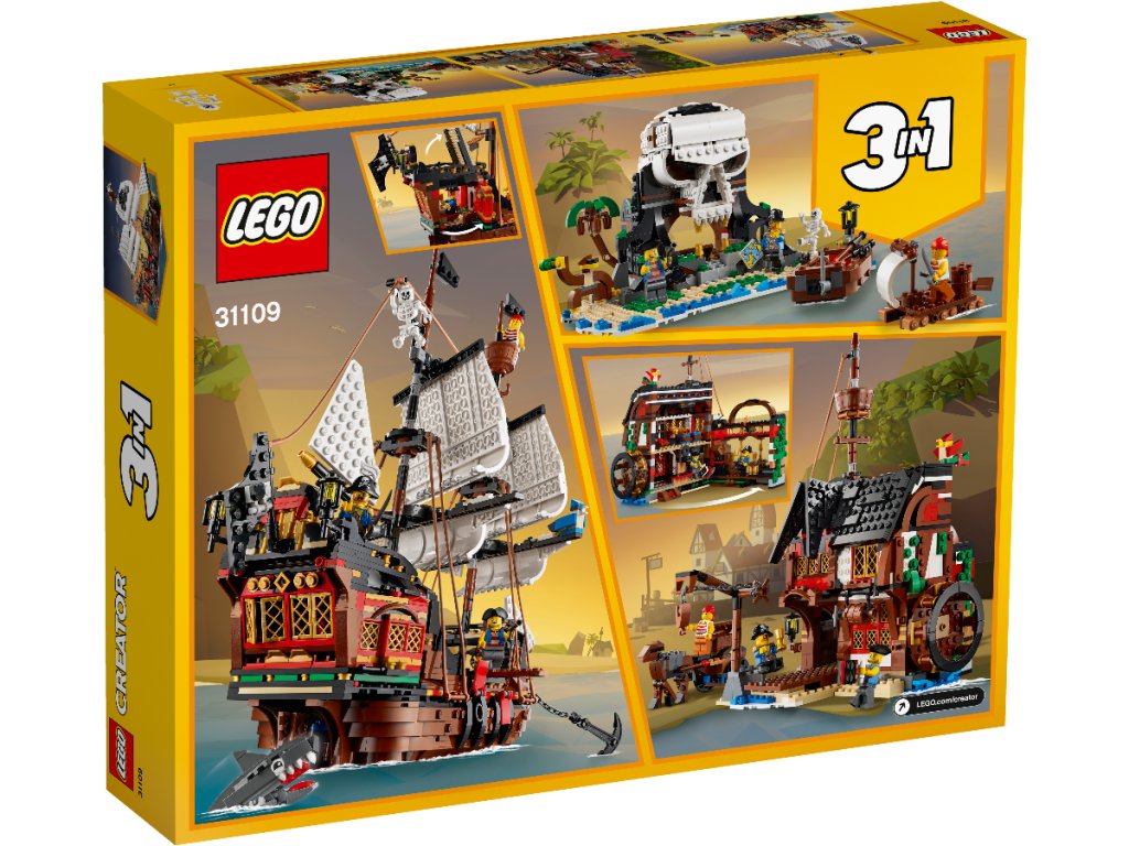 - Súprava Pirátska loď zo série LEGO® Creator 3 v 1 (31109) podnecuje u detí kreatívnu hru. Obsahuje 3 modely v 1: klasickú pirátsku loď, vidiecku pirátsku krčmu a tajuplný ostrov lebiek. Stavanie a prestavovanie udržiavania nákladov v priebehu hier.