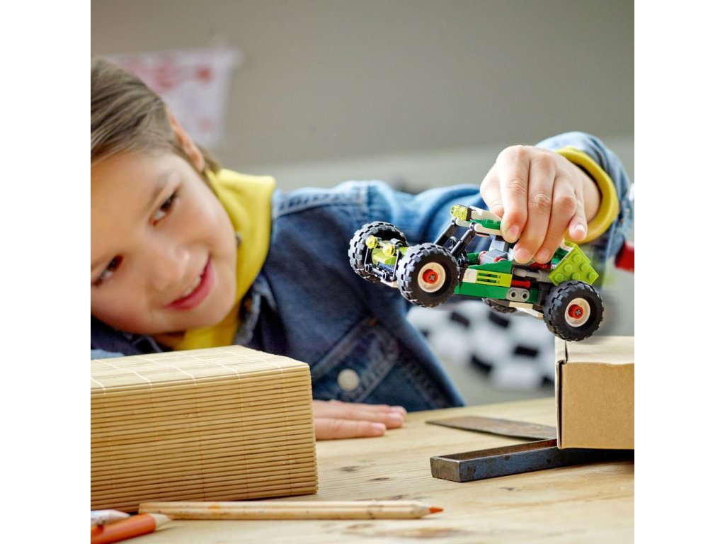 Malých staviteľov s týmto setom LEGO® Creator 3 v 1 Terénna bugina (31123) čakajú napínavé dobrodružstvá za volantom. Deti vo veku od 7 rokov sa určite skvele zabavia na pretekoch s výkonnou buginou, ktorá má veľké kolesá, pôsobivú ochrannú klietku, offroadový nárazník a spojler. Tvorivá zábava pre vášnivých fanúšikov áut Deti s touto stavebnicou zo série LEGO Creator 3 v 1 získajú 3 rôzne modely. Môžu si postaviť terénnu buginu, ktorá sa dá prestavať na výkonný predný nakladač s parádnou zdvíhacou plošinou, štvorkolku (terénne vozidlo) pre ešte dynamickejšie preteky alebo môžu zapojiť vlastnú fantáziu a vytvoriť z rovnakej súpravy kociek niečo úplne nové. Digitálny zážitok pre staviteľov LEGO Súčasťou stavebnice je aj digitálny návod na umocnenie zábavného zážitku zo stavania. Nástroje na približovanie a otáčanie v aplikácii LEGO Building Instructions pre smartfóny a tablety prinesú deťom vizu