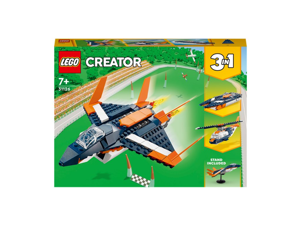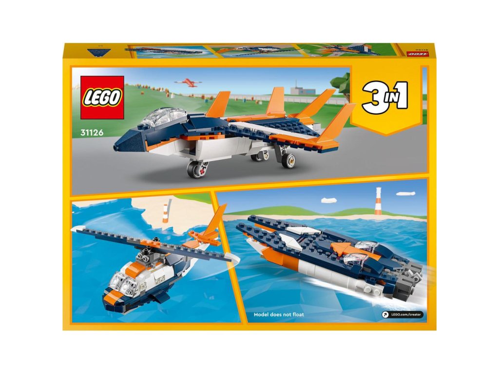 - 3 modely 1 – deti môžu poskytnúť tvorivú zábavu tak stavebnú LEGO® Creator 3 v 1 Nadzvuková stíhačka (31126), ktorá obsahuje modely stíhačiek, helikoptéry a motorového člna