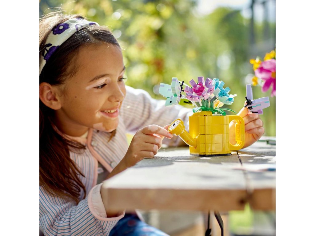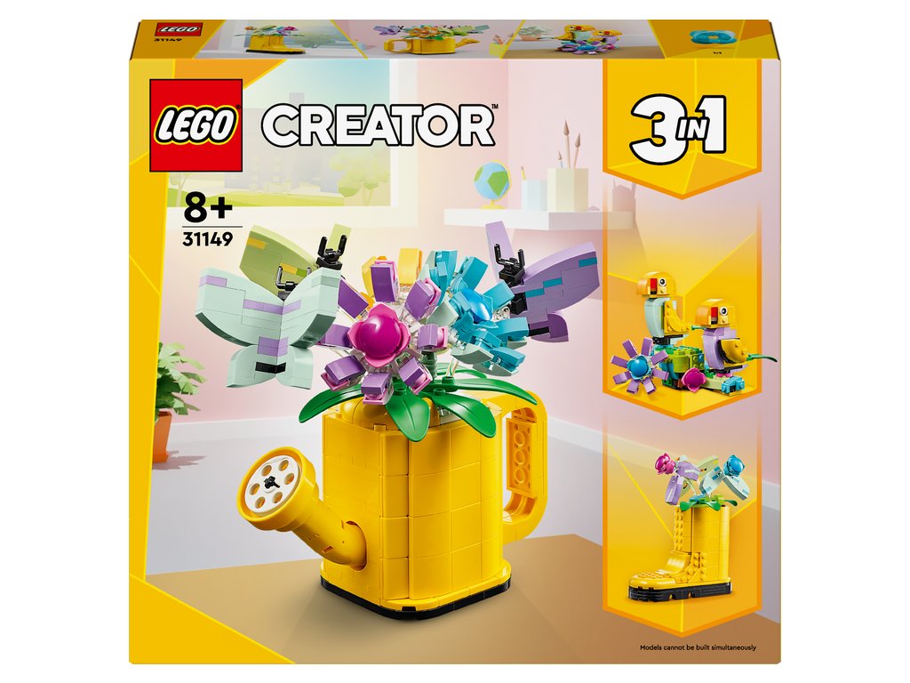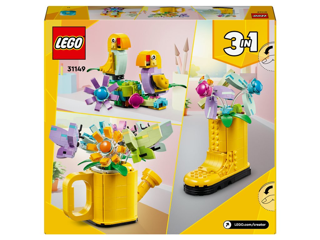 Stavajte, prestavujte, hrajte sa a vystavte si 3 farebné modely inšpirované prírodou s touto stavebnicou LEGO® Creator 3 v 1 Kvety v krhle (31149). Model obsahuje hračkársku žltú krhlu z kociek s rukoväťou a výlevkou, v ktorej sú 3 hračkárske kvety s pohyblivými okvetnými lístkami a takisto 3 hračkárskych motýľov na priehľadných tyčinkách, ktoré vytvárajú dojem, že lietajú.