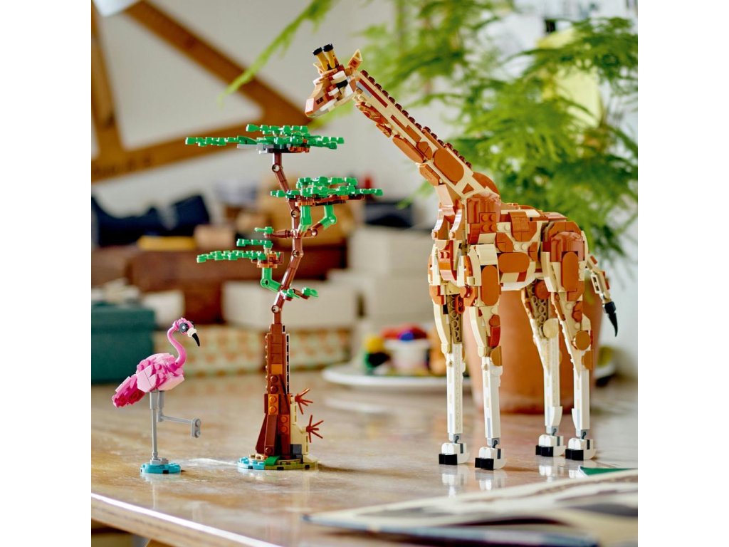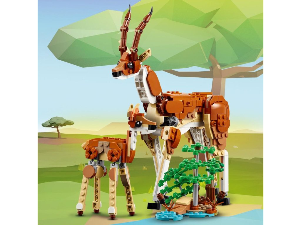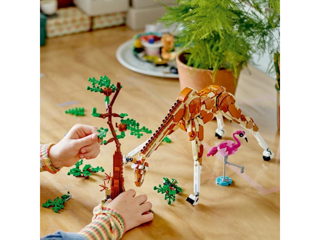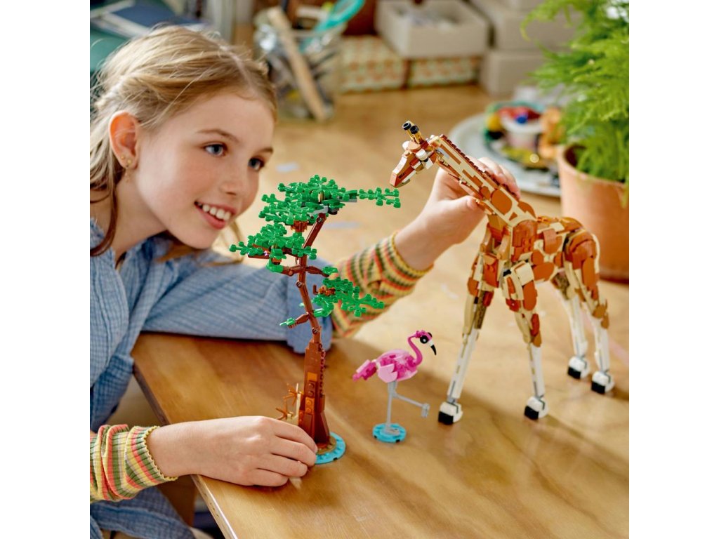 Táto stavebnica LEGO deťom svet herných možností s 3 rôznymi hračkárskymi zvieratkami, ktoré môžu postaviť z jedného kociek. Na výber majú polohovateľnú hračkársku žirafu so stromom a plameňom, ktorú následne môžu prestaviť na 2 polohovateľné hračkárske gazely (mamu a jej mláďatko) a 2 kríky alebo na hračkárskeho leva so stromom a motýľom.