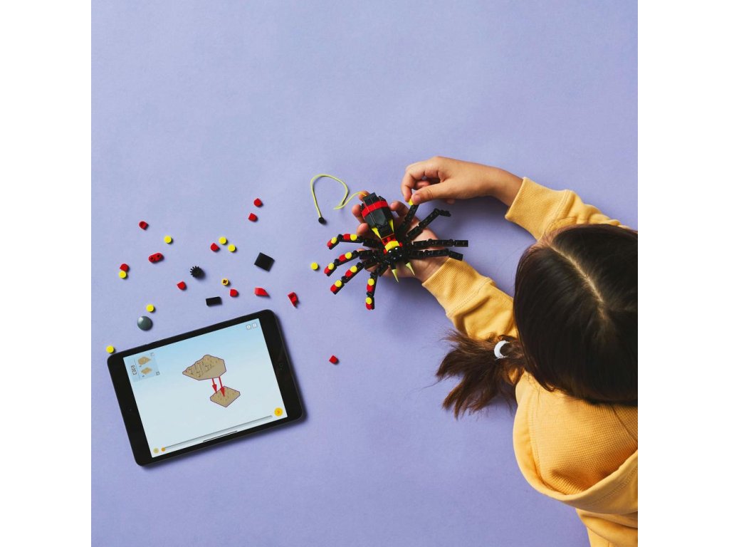 - Stavebnica pavúka LEGO® na hranie a vystavenie – Po hre si deti môžu zvieracie figúrky vystaviť a na chrbte pavúka nájdu neónovo žltú pavučinu, ktorú môžu zavesiť na kocku LEGO