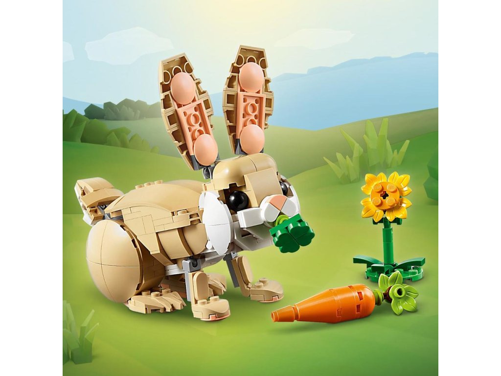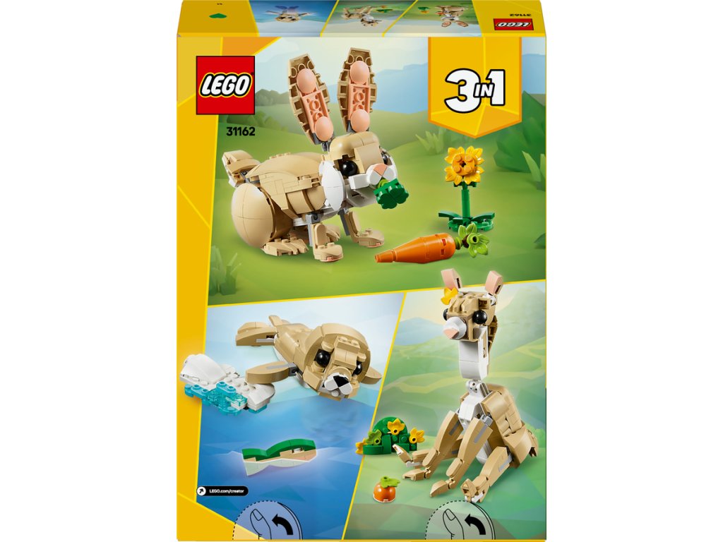 Doprajte milovníkom zvierat od 8 rokov zábavné dobrodružstvá so stavebnicou LEGO® Creator 3 v 1 Roztomilý zajačik (31162). Stavebnica so zvieratkami obsahuje hračkárskeho zajačika s pohyblivou hlavou, ušami aj prednými a zadnými labkami, na ktorých môže stáť (na 2 alebo 4 labkách), a dodáva sa aj so slnečnicou a mrkvou.