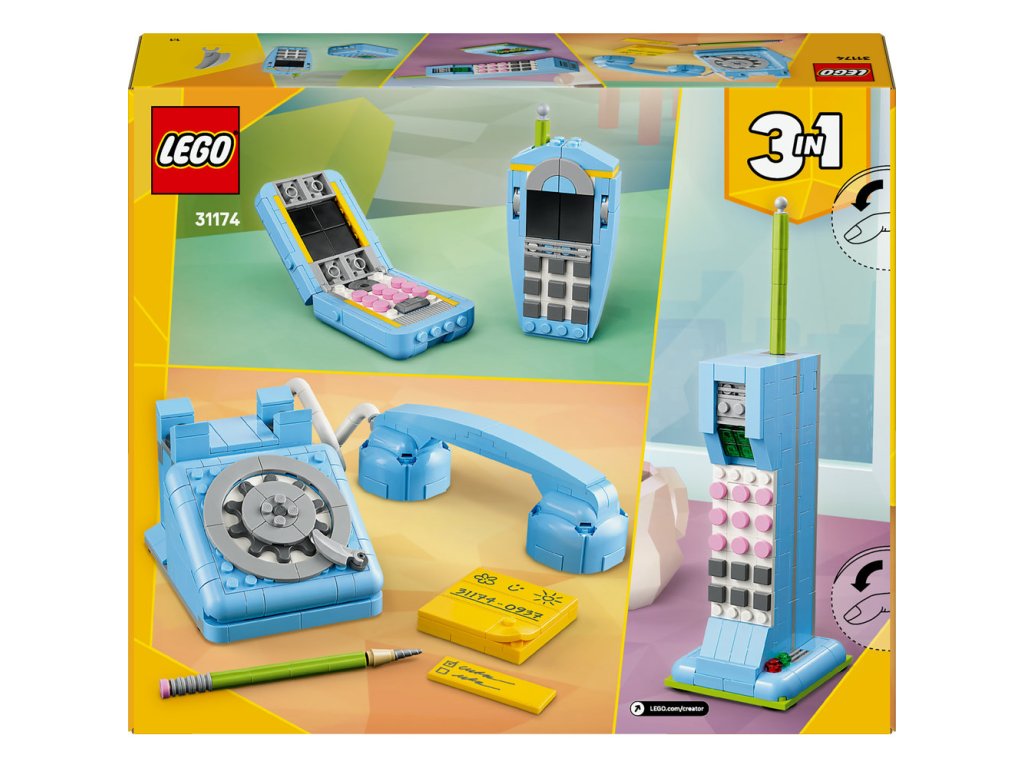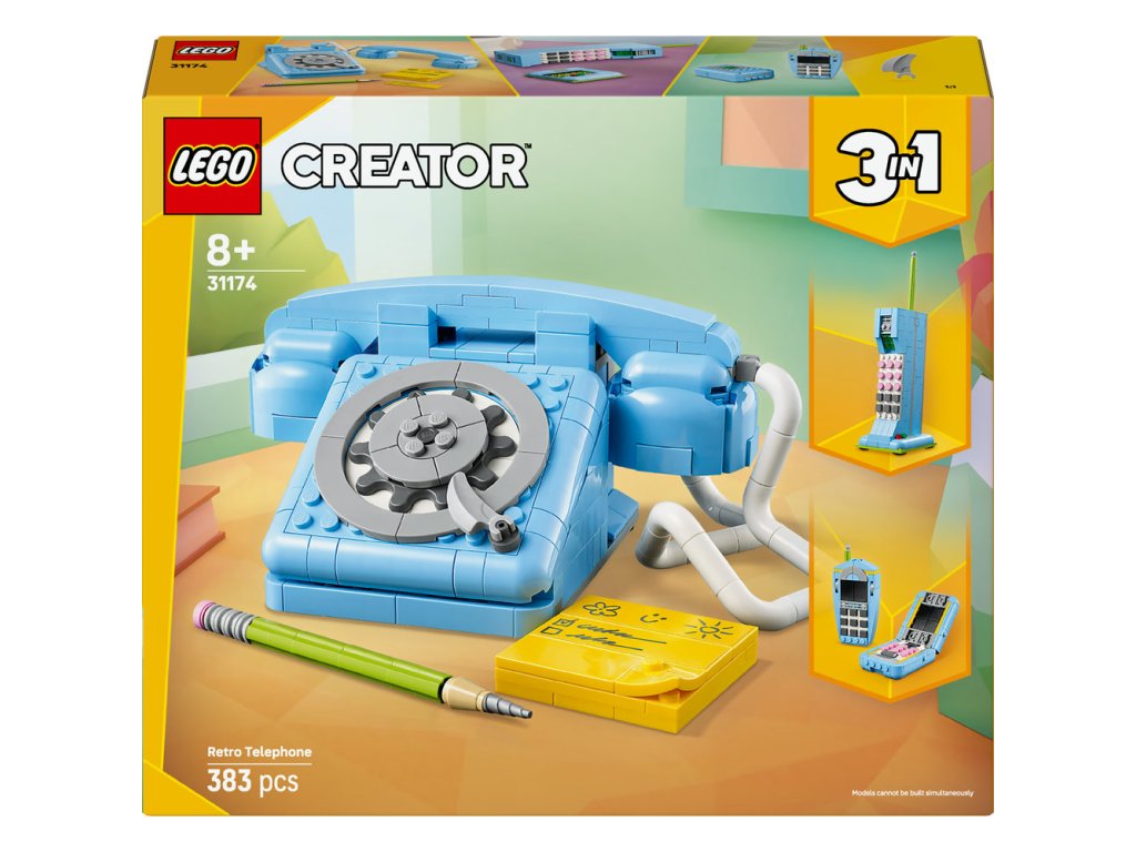 Nostalgickí dospelí a tvorivé deti od 8 rokov sa môžu vrátiť v čase s touto štýlovou stavebnicou LEGO® Creator 3 v 1 Retro telefón (31174). Model obsahuje štýlový retro telefón zo 60. rokov 20. storočia so zdvíhacím slúchadlom, flexibilným káblom,otočným ciferníkom a pružinovou funkciou, keď telefón zložíte. Retro stavebnica obsahuje aj ceruzku z kociek a prispôsobiteľný samolepiaci poznámkový blok, na ktorom si môžete vybrať z 3 rôznych dielikov s odkazmi. Táto pôsobivá stavebnica LEGO skrýva až 3 možnosti stavania z jedného balenia kociek: retro telefón zo 60. rokov 20. storočia, hračkársky telefón z 80. rokov 20. storočia na nabíjacom stojane alebo 2 parádne telefóny zo začiatku nového milénia. Stavebnice zo série LEGO Creator 3 v 1 budú skvelými darčekmi pre deti. Každá stavebnica ponúka až 3 rôzne možnosti stavania. S prestaviteľnými stavebnicami 3 v 1 si deti užijú tvorivé hry a všetci stavitelia si tu príde na svoje, bez ohľadu na ich záľuby. Modely nie je možné postaviť súčasne. Stavebnica obsahuje 383 dielikov.