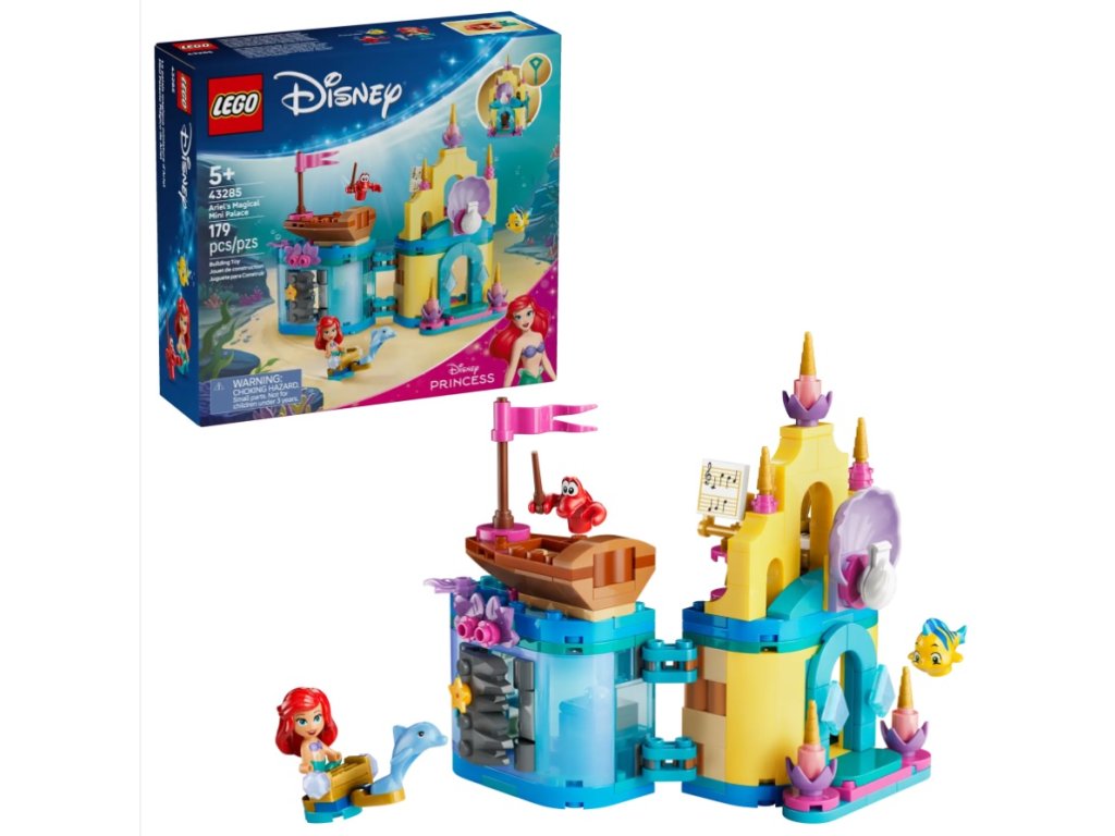 - STAVEBNICA PODĽA MALEJ MORSKEJ VÍLY OD DISNEY – V modeli Ariel a jej kúzelný miniatúrny palác (43285) nájdete postavičky LEGO® ǀ Disney Ariel, Šupinky a Sebastiana, malú loďku a minipalác s jaskynkou, ktorý sa dá uzamknúť