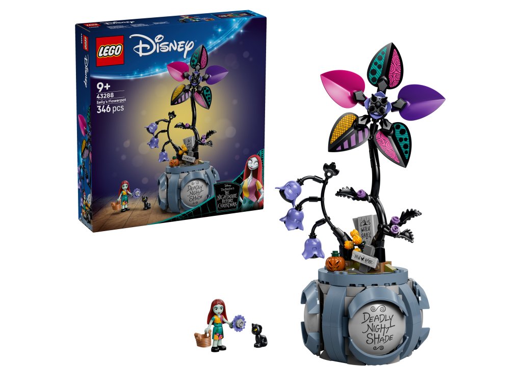 - POSTAVIČKY A PRVKY – Stavebnica s figúrkami LEGO ǀ Disney Sally a malou čiernou mačkou prináša okrem nich aj kvet s 3 okvetnými lístkami (z 5), ktoré pasujú k oblečeniu Sally, a 3 nálepky