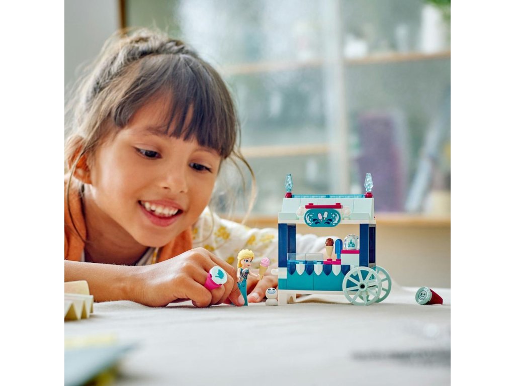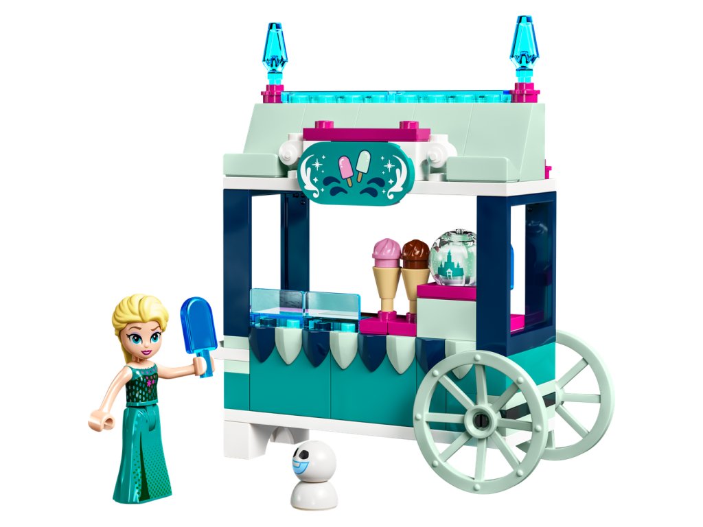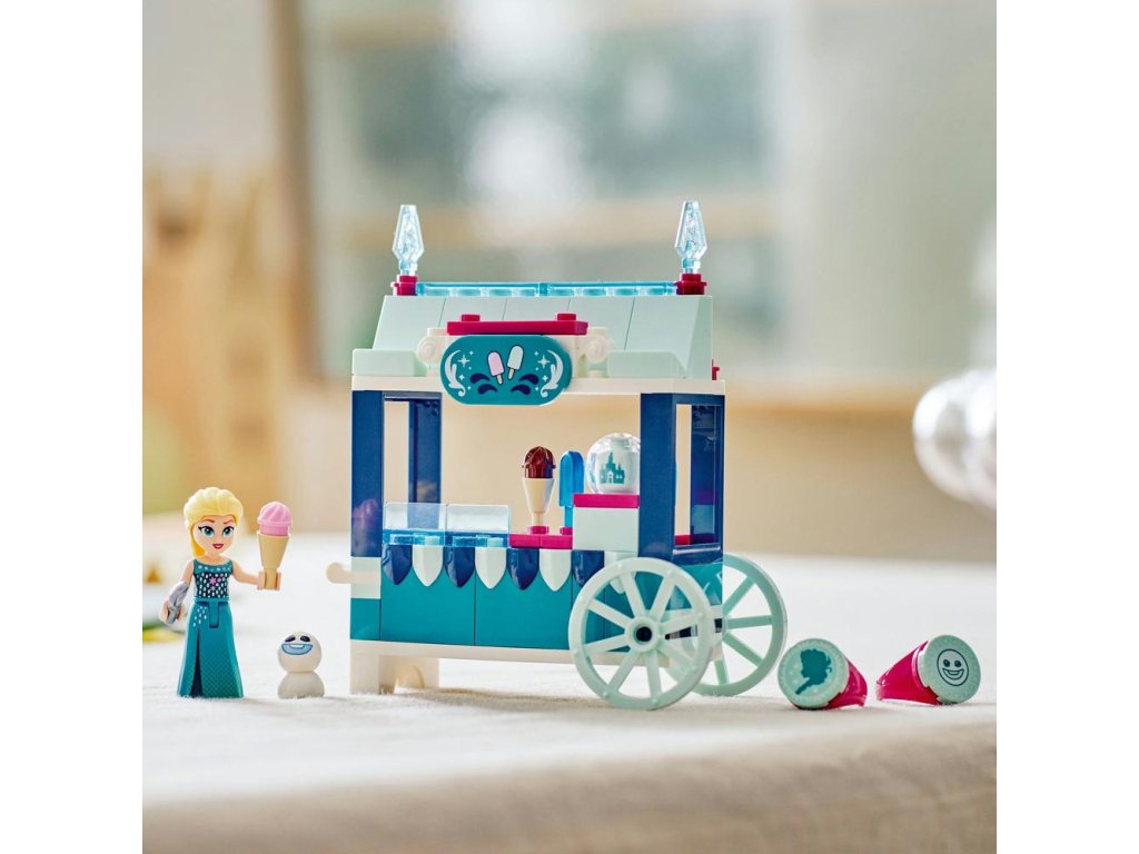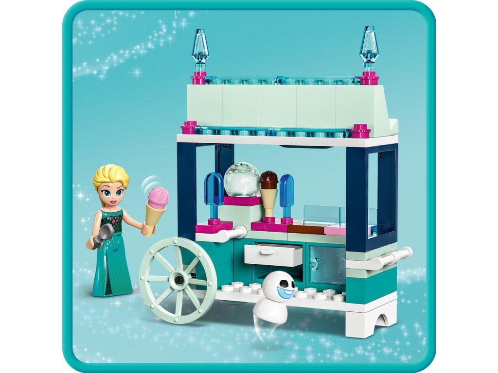 Balenie obsahuje zostaviteľný zmrzlinársky stánok so zmrzlinovačom, 2 kornútky, 2 nanuky a ďalšie prvky, ktoré inšpirujú vymýšľanie príbehov. Nájdete tu minibábiku Elsy LEGO ǀ Disney a figúrku snehuliačika LEGO ǀ Disney na hry na postavy, ako aj 2 zberateľské prstene s vymeniteľnými ozdobami.