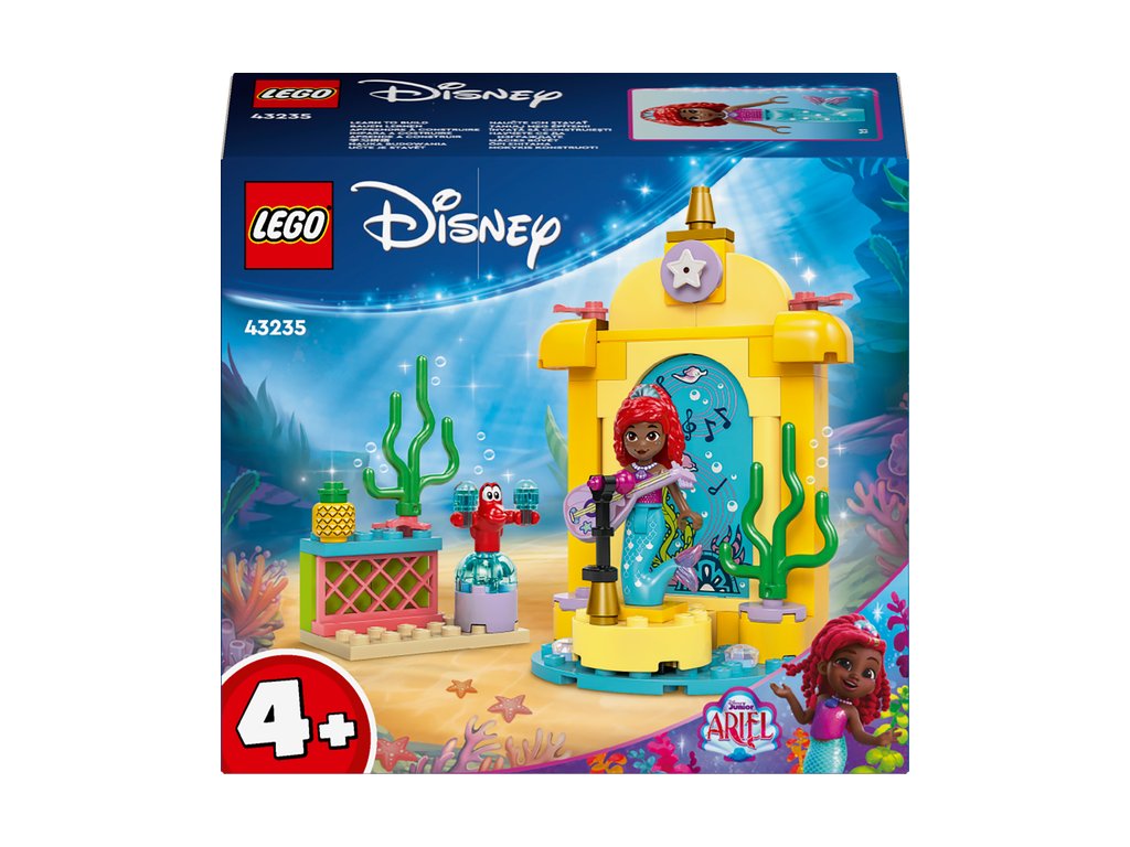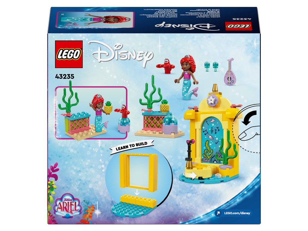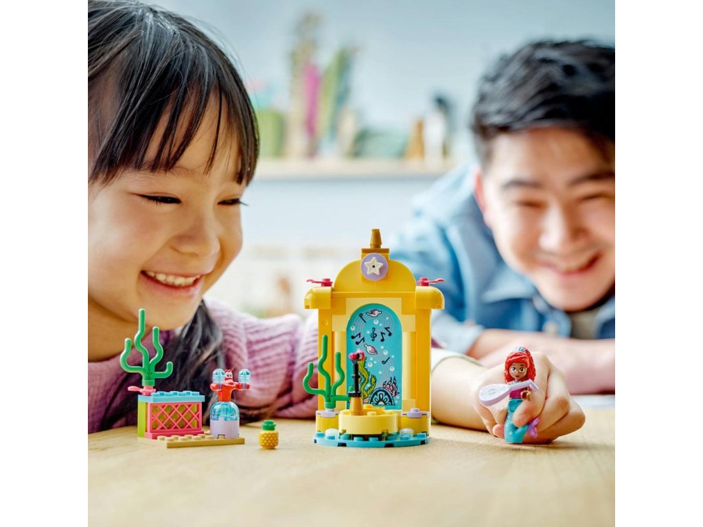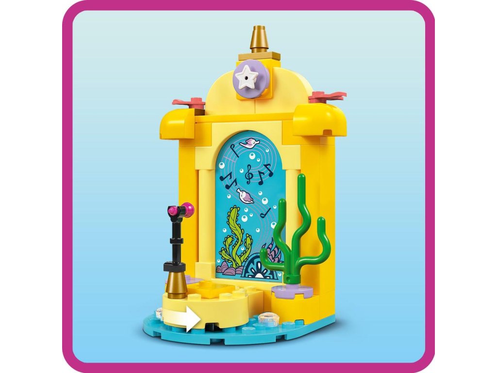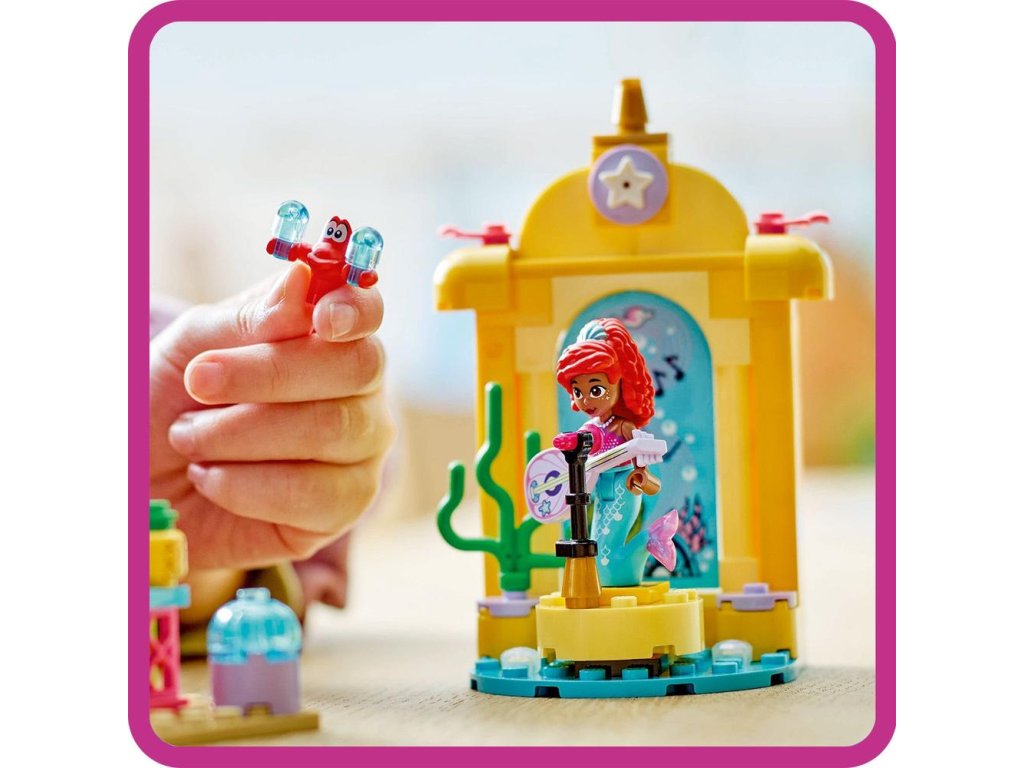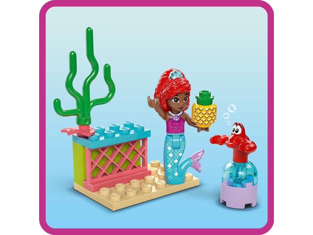 Táto stavebnica obsahuje minibábiku LEGO ǀ Disney Ariel a zvieraciu figúrku LEGO ǀ Disney Sebastiana. V modeli nájdete aj pódium s otáčajúcou sa podlahou, bufet s občerstvením so stoličkou a zábavné prvky, s ktorým sa môžete pustiť rovno do vymýšľania príbehov, vrátane gitary, rumba gulí a ananásu. Prvok štartovacej kocky dá deťom pevný základ na hru a k dispozícii majú aj intuitívny návod na stavanie v podobe farebného obrázkového návodu vytvoreného špeciálne pre deti, ktoré sa začínajú učiť čítať.