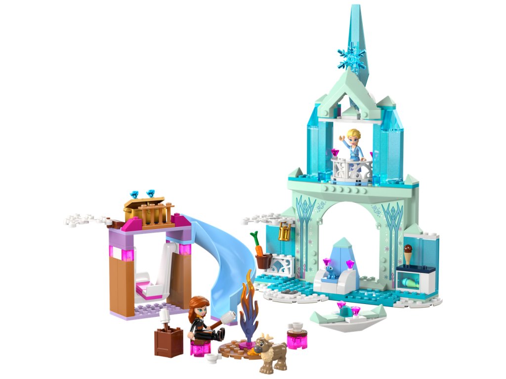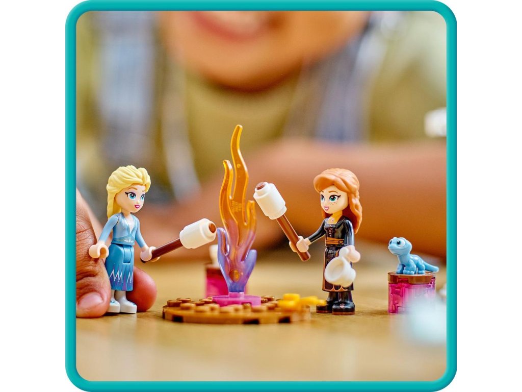 Nájdete tu hrad s kuchyňou, krbom, hojdačkou a šmýkačkou, táborákom, malým ľadovým kanoe a množstvom rozprávkových prvkov. Model obsahuje minifigúrky Elsy a Anny LEGO ǀ Disney a navyše figúrky zvieratiek Bruniho a malého soba LEGO ǀ Disney.