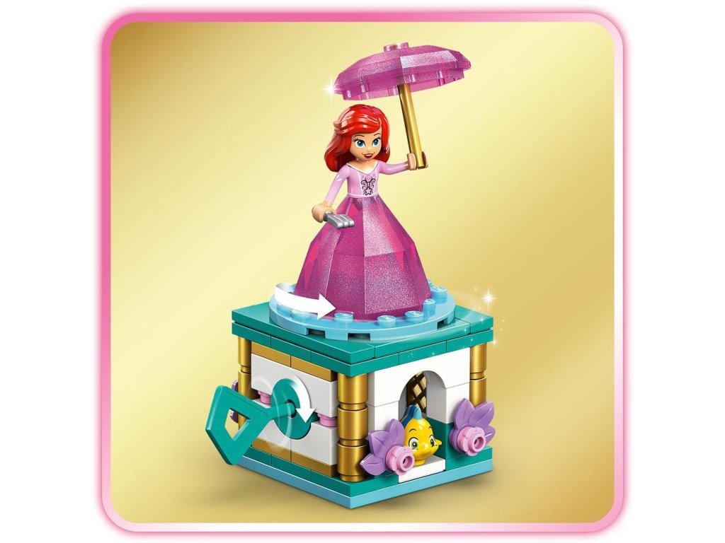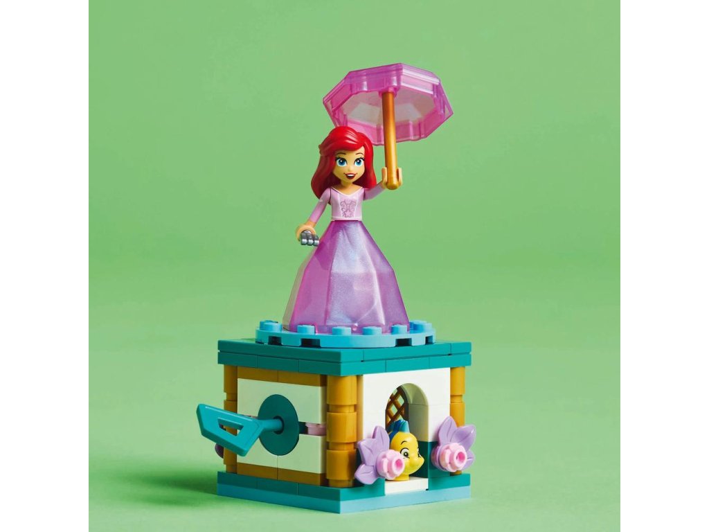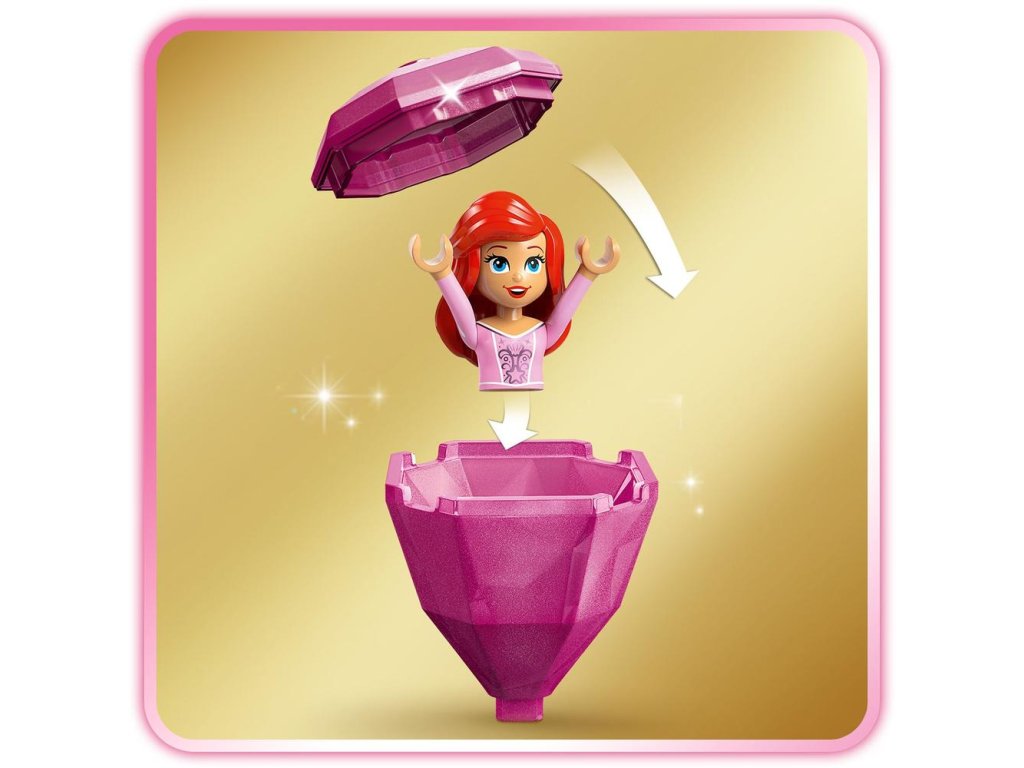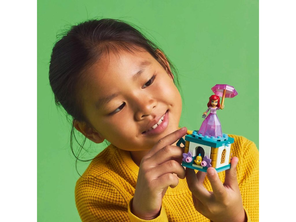 - Pútavá hračkárska stavebnica – Otočením kľúča na stojane sa doštička s Ariel začne otáčať. Potom uložte figúrku minibábiky LEGO® ǀ Disney do „diamantových“ šiat a dáždnik použite ako vrchnák