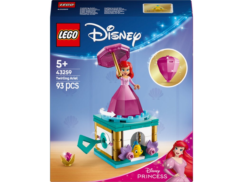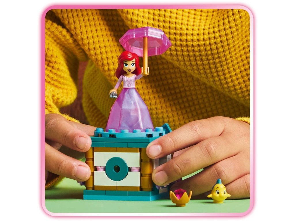 - Stavebnica s Disney princeznou – Tátostavebnica obsahuje stojan s gramofónom a kľúčom, minibábiku Ariel LEGO® ǀ Disney v meniacich sa „diamantových“ šatách a figúrku ryby Flounder LEGO ǀ Disney