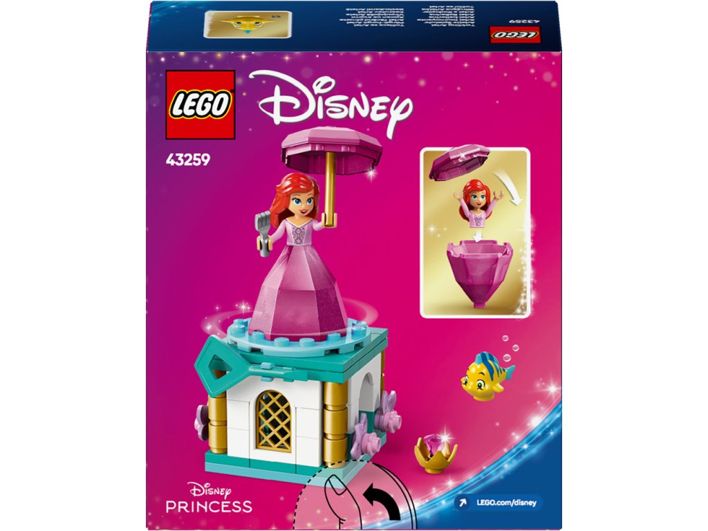 Očarte deti a fanúšikov Malej morskej víly od Disney vo veku od 5 rokov touto stavebnicou LEGO® ǀ Disney Princezné Točiaca sa Ariel (43259), ktorá obsahuje rozprávkový stojan s rotujúcou doštičkou, kľúčom, vidličkou a priestorom pre Floundera, akoaj „diamantom“ na stranách. Deti môžu umiestniť Ariel do „diamantových“ šiat s dáždnikom ako vrchnákom, aby bola bezpečne ukrytá. Tento zostaviteľný model Disney bude zábavným darčekom pre dievčatá, chlapcov a všetkých filmových fanúšikov, vyzerá skvele na výstavke a je ideálny na krátke a zábavné každodenné hranie.
