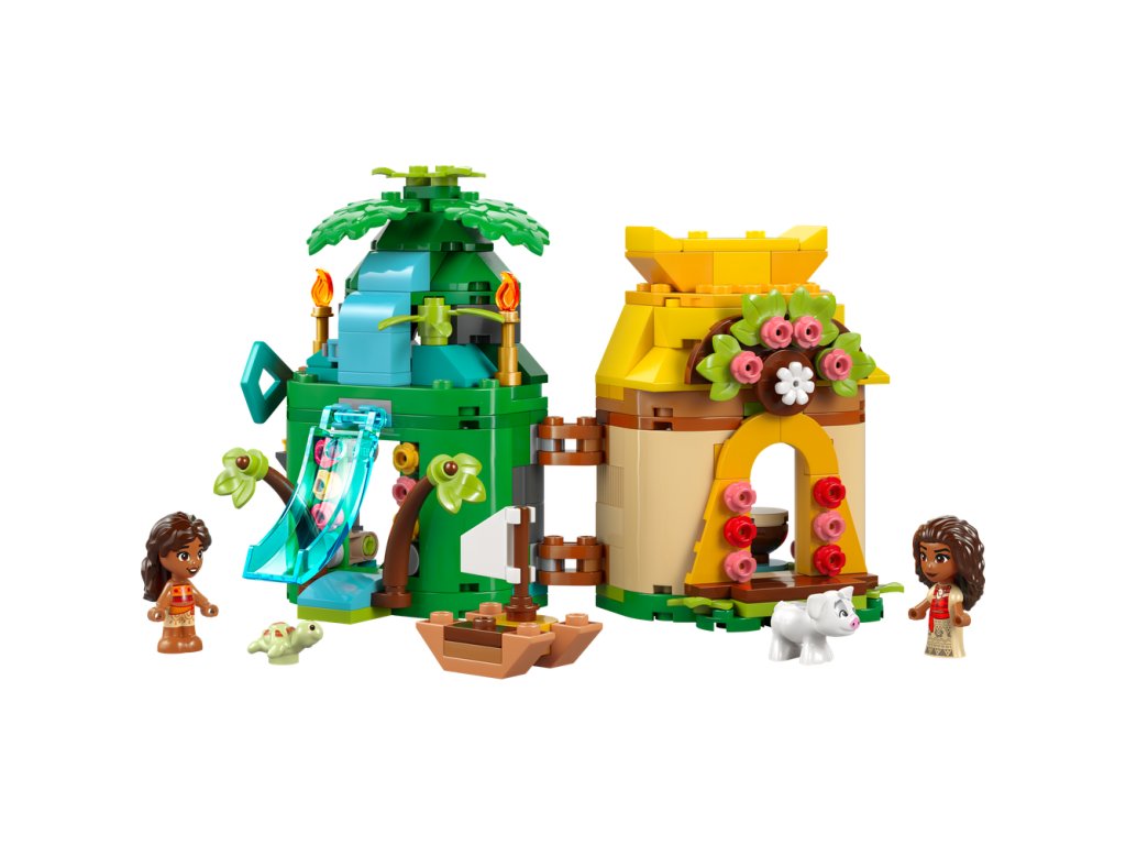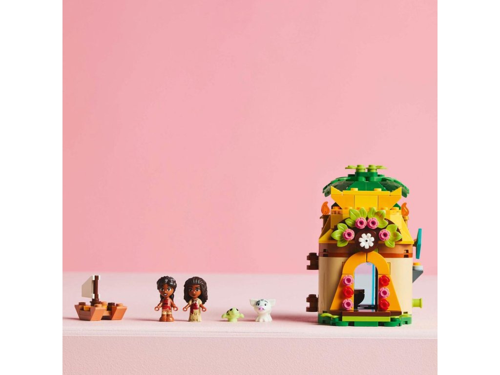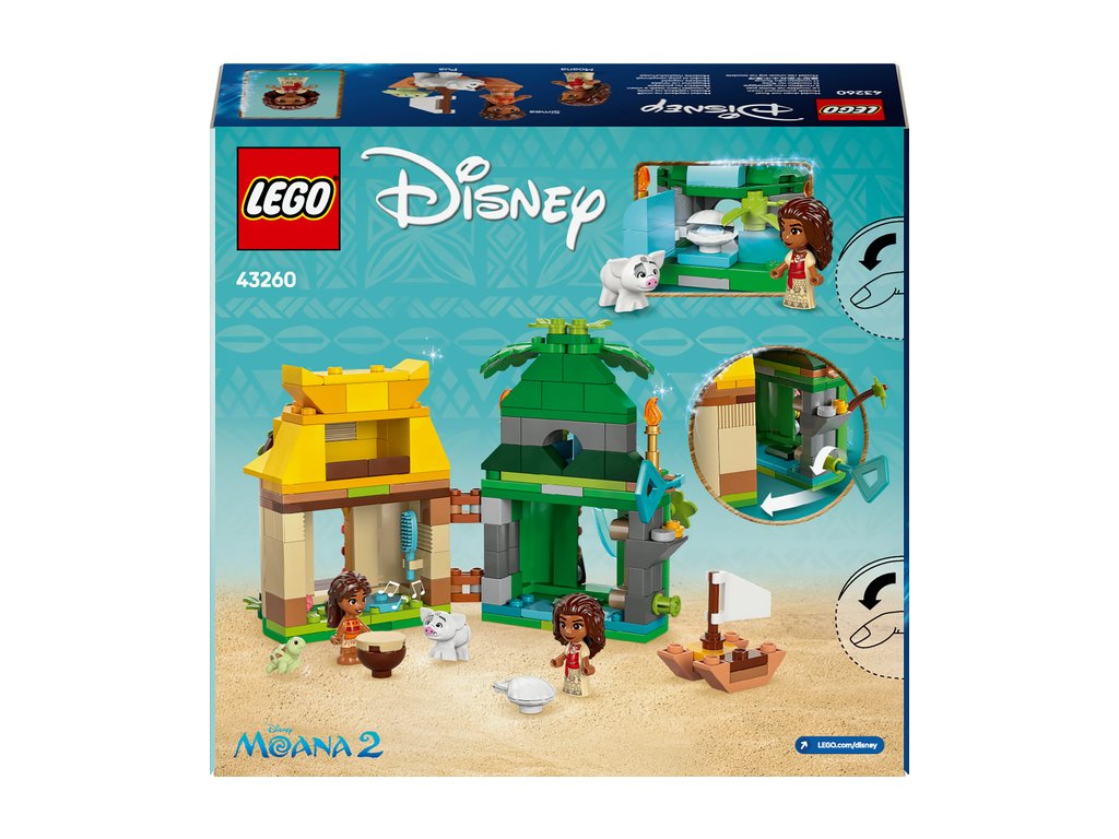 - Mikrosvet v stavebnici – Zostaviteľná hračka obsahuje obojstranný model ostrova/domčeka s kľúčom, mikrobábiky LEGO® ǀ Disney Vaiany a malej sestry Simey a zvieraciu figúrku LEGO ǀ Disney prasiatka Pua
