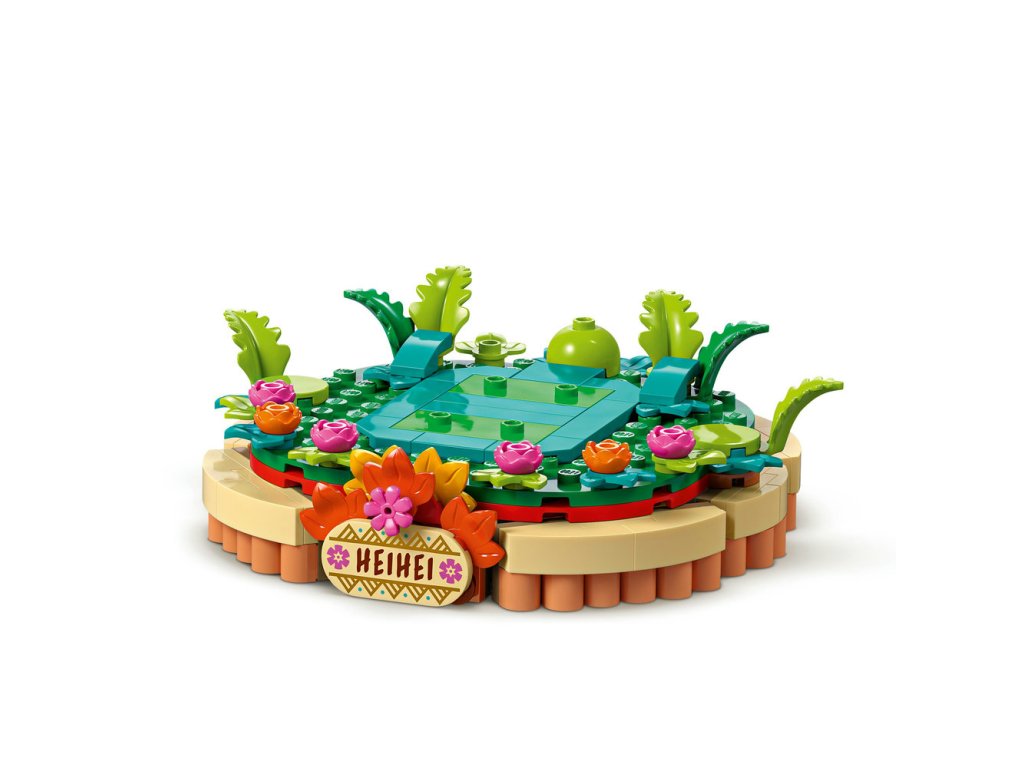 - Zostaviteľná výstavná hračka – Polohovateľný model Vaianinho spoločníka Heiheia z kociek na výstavnom podstavci s ozdobnými kvetmi a ceduľkou