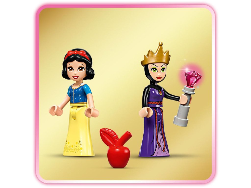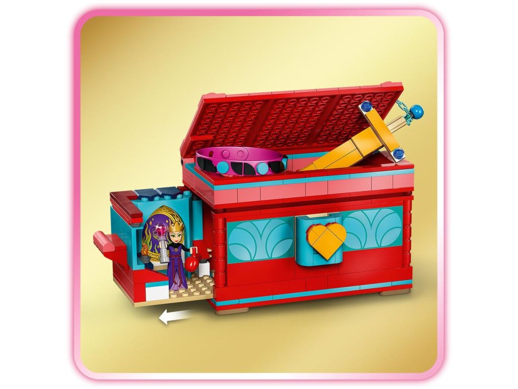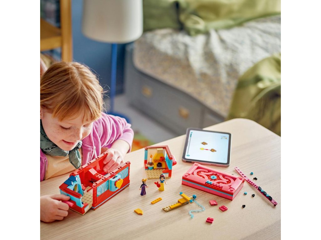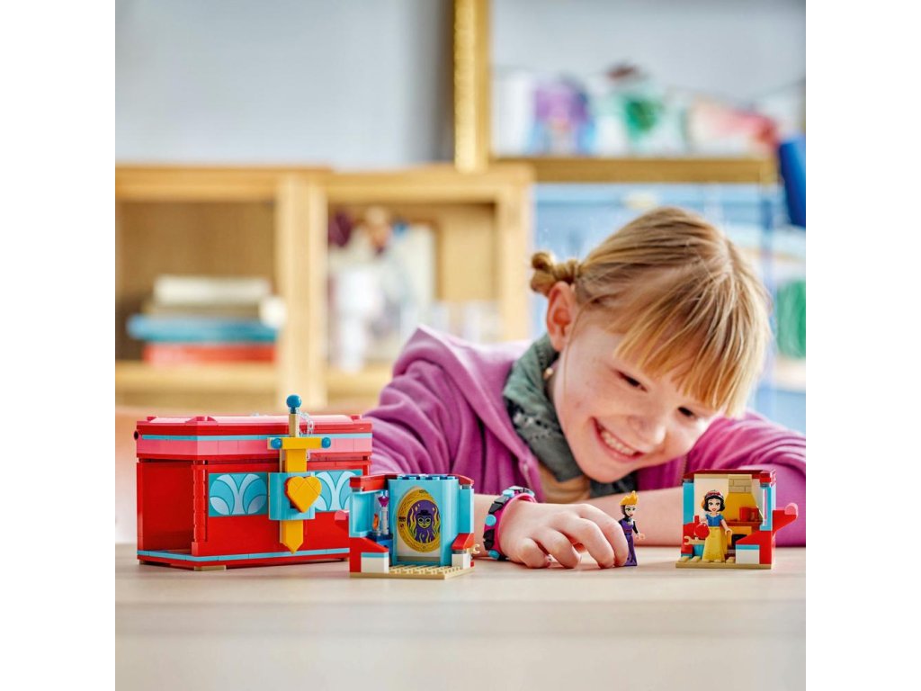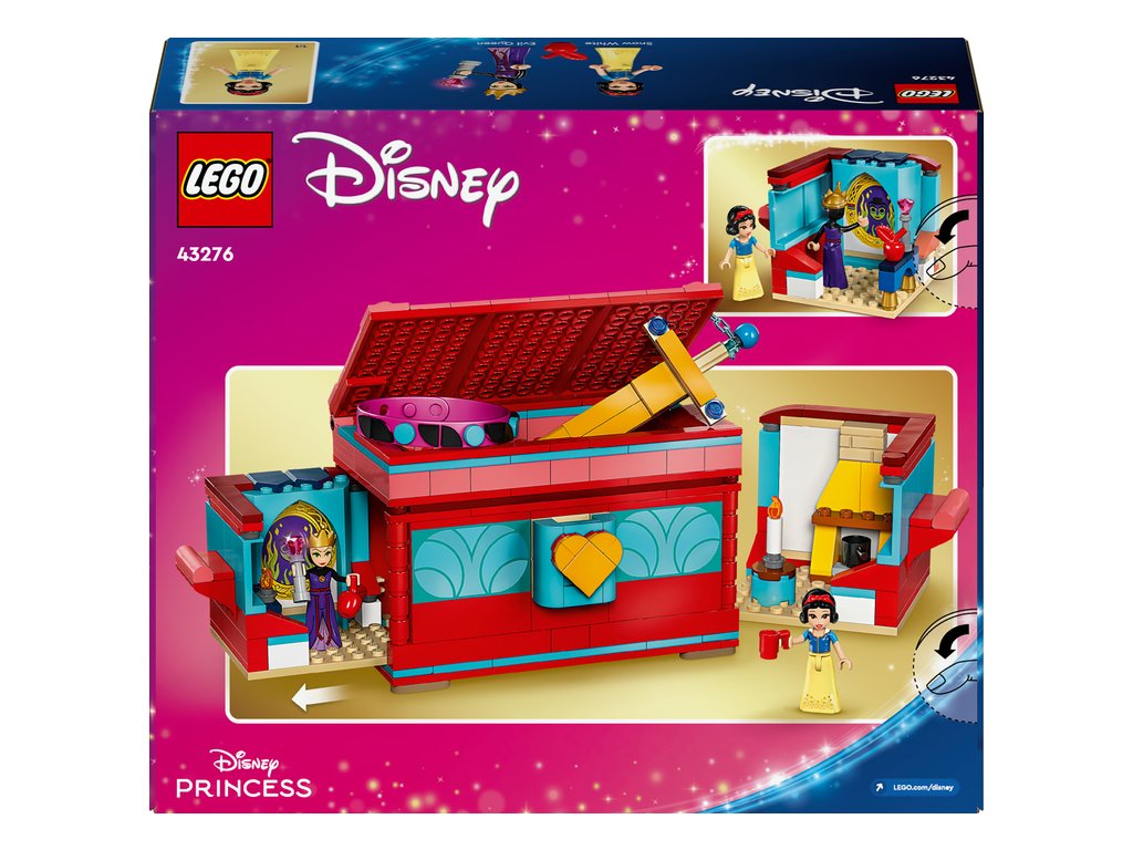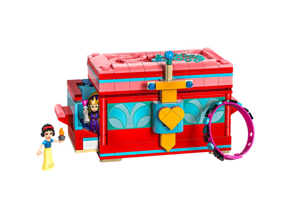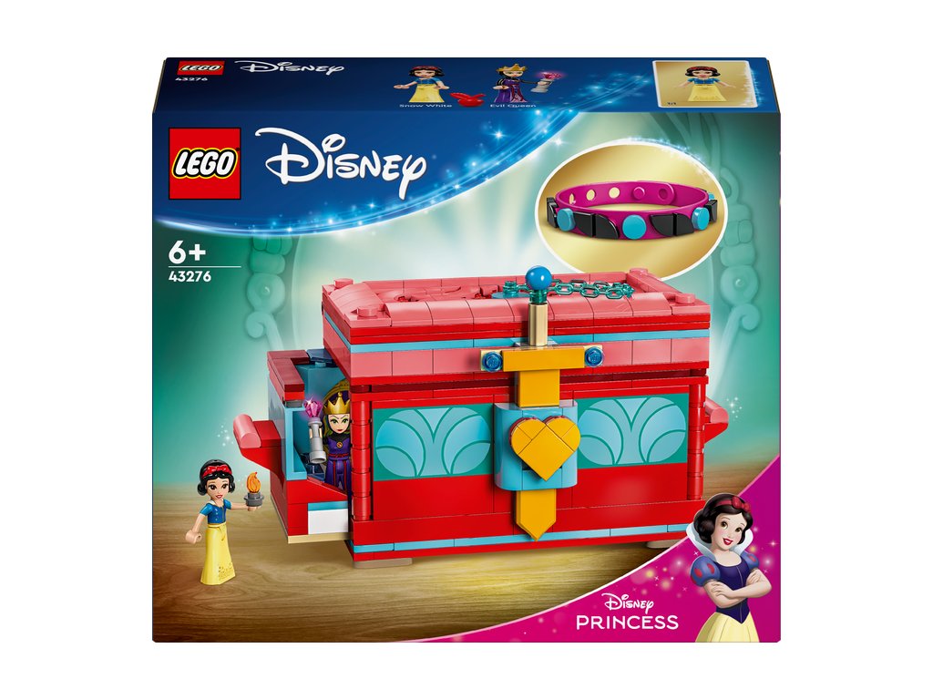 Potešte deti a fanúšikov Disney od 6 rokov fantastickým darčekom v podobe zostaviteľnej Snehulienkinej šperkovnice LEGO® ǀ Disney (43276). Model obsahuje škatuľku s otváracím viečkom a úchytkami na každej strane, ktorými ju môžete otvoriť a odhaliť skryté miestnosti, meč a zámok na retiaze, ako aj minifigúrky LEGO ǀ Disney Snehulienky a Zlej kráľovnej a farebný náramok s množstvom ozdobných prvkov, ktorý si môžete navrhnúť, nosiť alebo ho niekomu darovať.