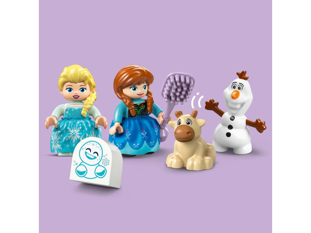 - Prvky z Ľadového kráľovstva – Súčasťou stavebnice je 5 postav LEGO® DUPLO® │ Disney: Elsa, Anna, Snehuliačik Marshmallow, Malý Sven a Olaf, ako aj doplnky vrátane šmykľavky, kŕmidla a kefy