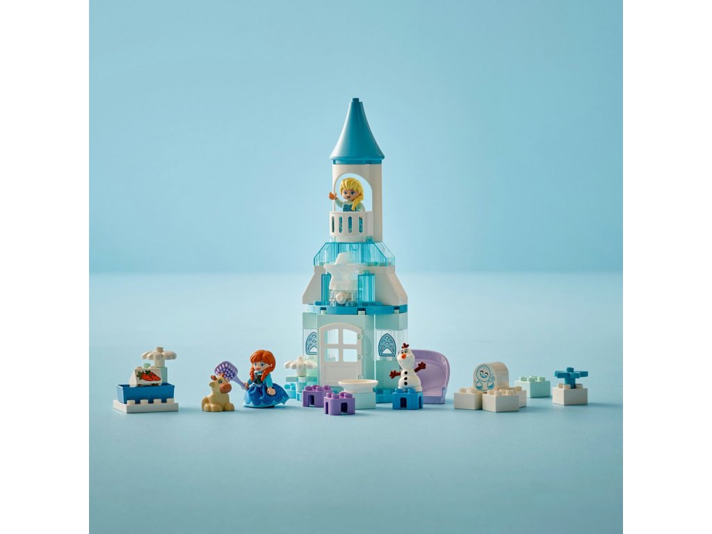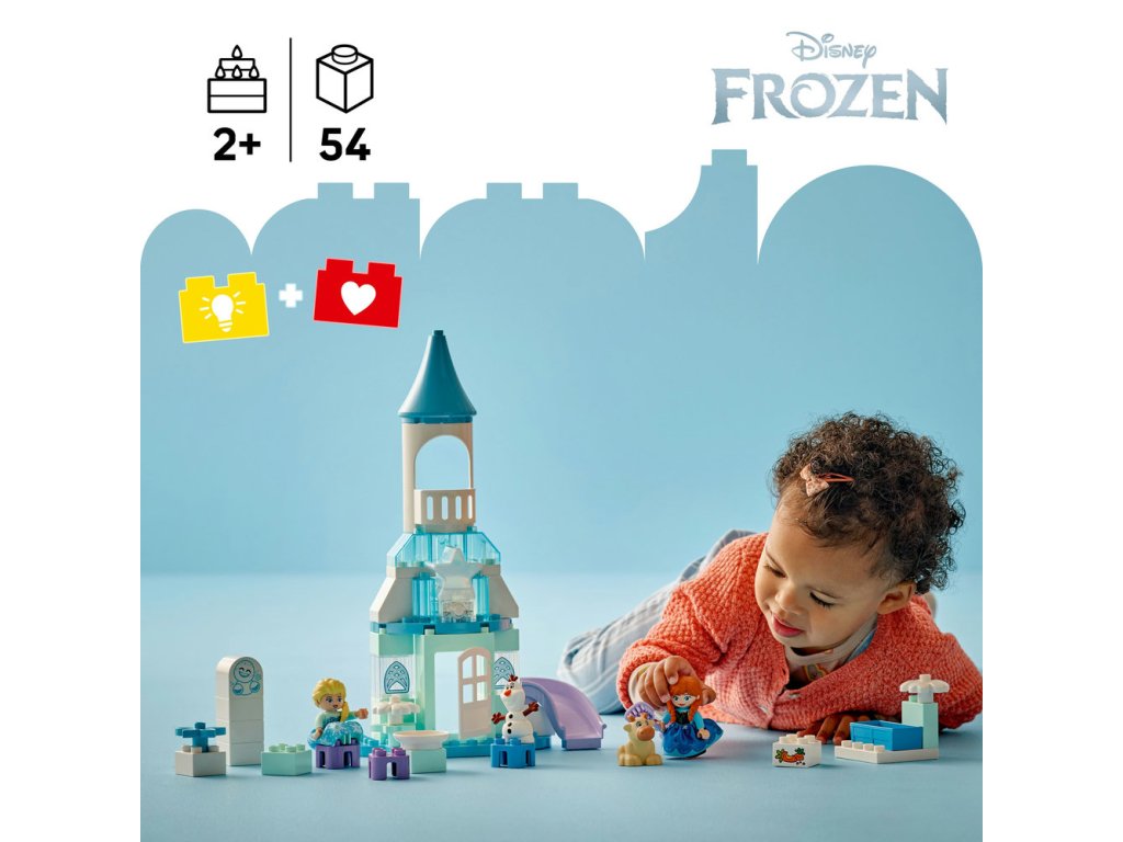 Táto vzdelávacia stavebnica pre malé deti obsahuje množstvo prvkov, ktoré stimulujú ich zmysly. Elsa a Anna majú oblečené látkové sukne, ktoré sú príjemné na dotyk, nájdete tu aj krídlové dvere, ktoré môžu malé prstíky otvoriť a preskúmať vnútro hradu v Ľadovom kráľovstve a model obsahuje farebnú svetelnú kocku, ktorá predstavuje polárnu žiaru. Stavebnica obsahuje 54 dielikov.