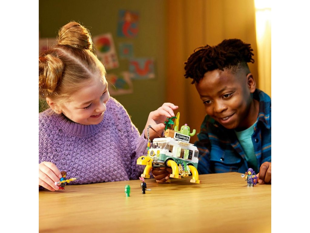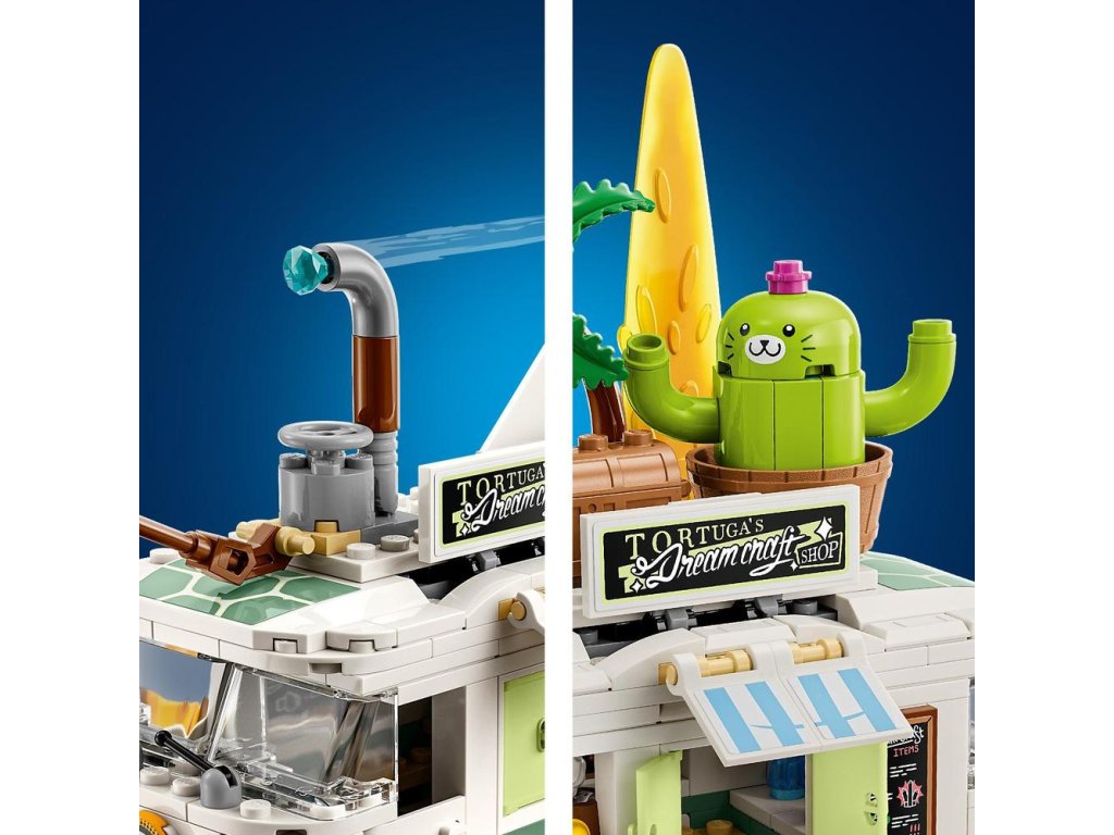 Doprajte deťom od 7 rokov dobrodružstvo vo Svete snov s pani Castillovou, Mateom a Zoey v tejto stavebnici LEGO® DREAMZzz™ Korytnačia dodávka pani Castillovej (71456). Stavebnica vychádza z napínavého televízneho seriálu DREAMZzz a ponúka deťom 2 spôsoby, ako si toto parádne vozidlo zostaviť. 1 dodávka, 2 možnosti stavania V základnej podobe má hračkárska Korytnačia dodávka pani Castillovej pohyblivé kolesá a odnímateľnú strechu. Deti si užijú hodiny jej prestavovania a zostavovania 2 rôznymi spôsobmi pomocou návodu s príbehom. V párty režime možno do dodávky doplniť pohyblivý strom, otáčajúci sa kaktus a otváraciu truhlicu s pokladom. V režime lietajúcej ponorky zasa možno korytnačiu dodávku doplniť o raketu a pohyblivý periskop. V tomto režime je k dispozícii aj lietajúca verzia Mačacieho kaktusu, ktorý môže cestovať spolu s ňou. Deti sa tak môžu naplno ponoriť do kreatívnej stavby a užiť si dvakrát také dlhé