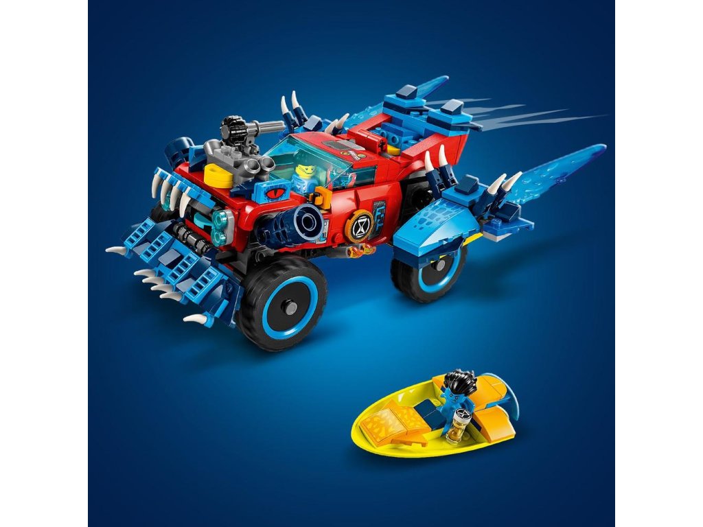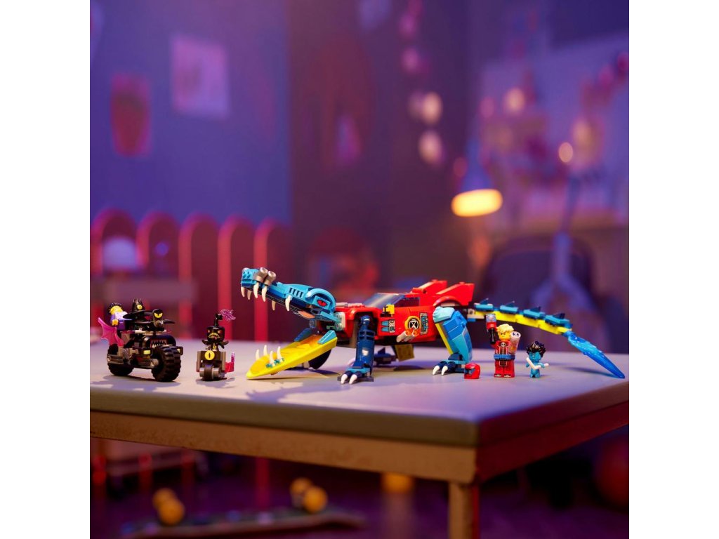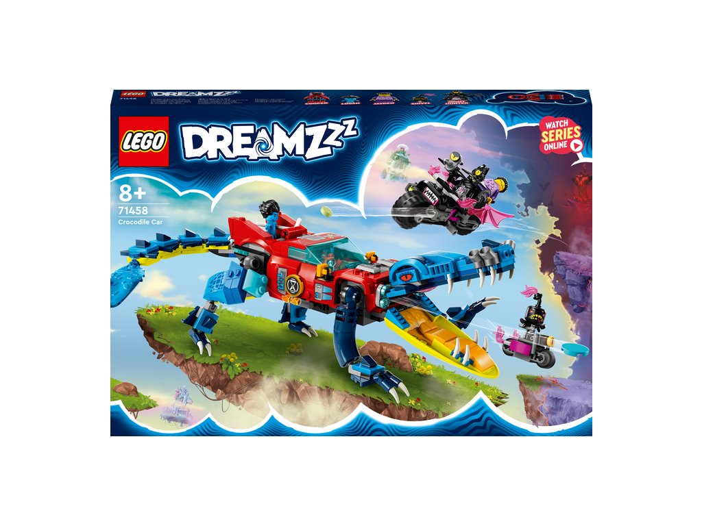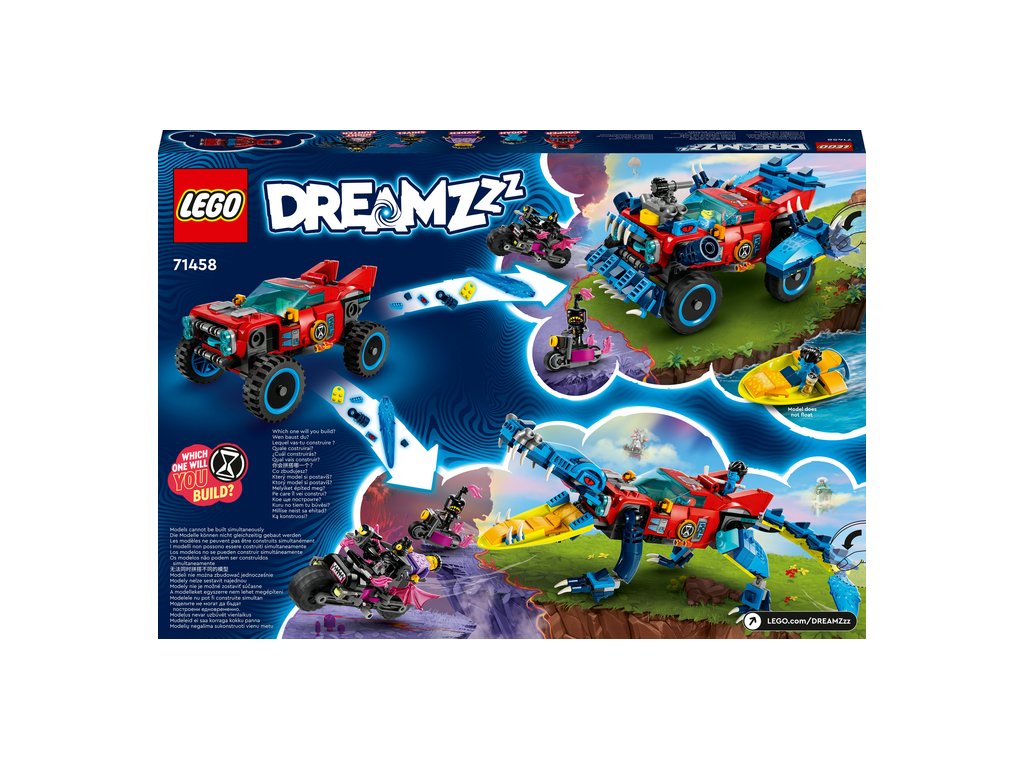 Deti od 8 rokov sa s touto stavebnicou LEGO® DREAMZzz™ Krokodílie auto (71458) dostanú do Sveta snov. Stavebnica je založená na televíznom seriáli a deti si v nej môžu vytvoriť úžasné auto, ktoré im pomôže zachrániť Jaydena pred strašidelným Nočným lovcom! 1 stavebnica, 2 možnosti ako ju postaviť Stavebnicu možno postaviť 2 spôsobmi a návod s príbehom povzbudí deti, aby si vybrali vlastné dobrodružstvo a užili si dvojnásobok času na hranie. Deti si môžu vybrať, či si postavia krokodílie auto na boj s nočnými morami, alebo superrýchly terénny automobil a miniponorku, v ktorých ich môžu prenasledovať. V režime krokodíla má vozidlo polohovateľné ruky a nohy a vystreľovač diskov ukrytý v prednej mriežke, takže deti môžu strieľať disky z krokodílej tlamy. V režime nákladného auta má vozidlo zasa pojazdné kolesá a odnímateľnú strechu, takže doň môžete posadiť minifigúrku. Fantastické minifigúrky Stavebnica obsa