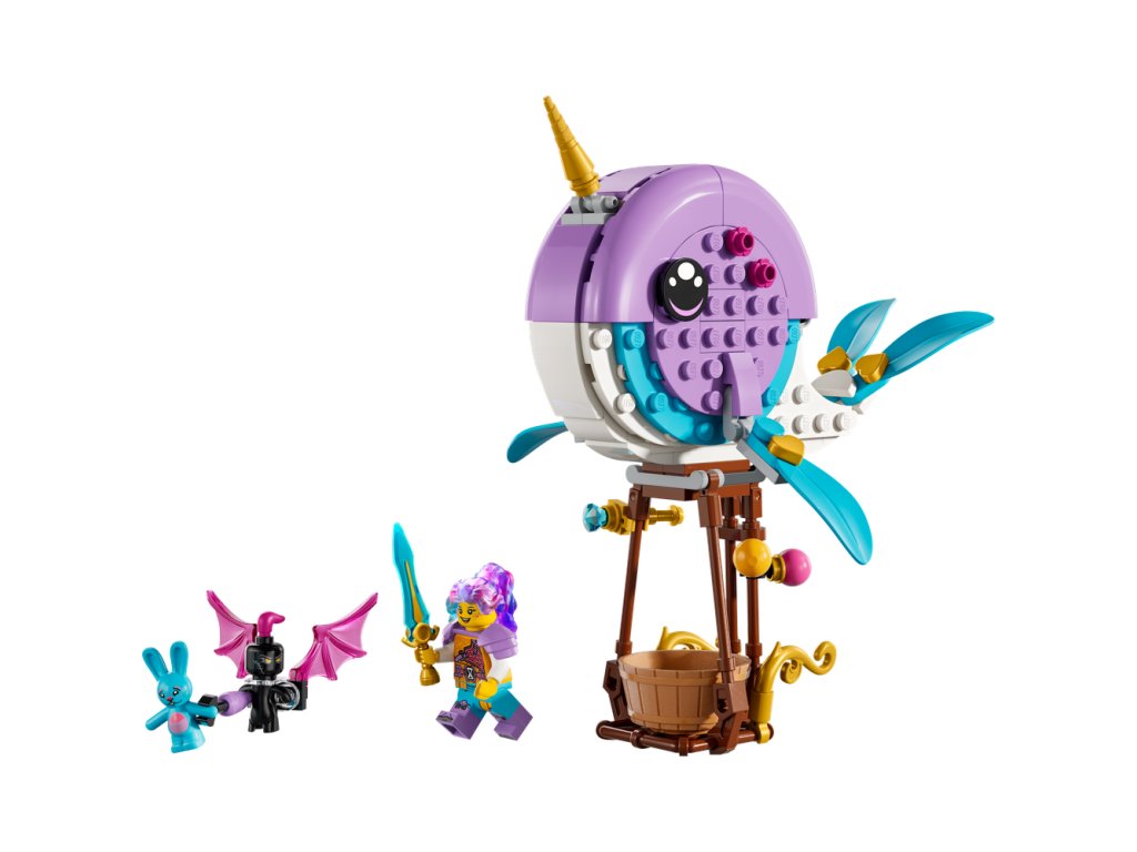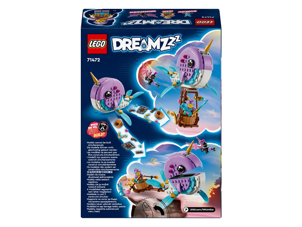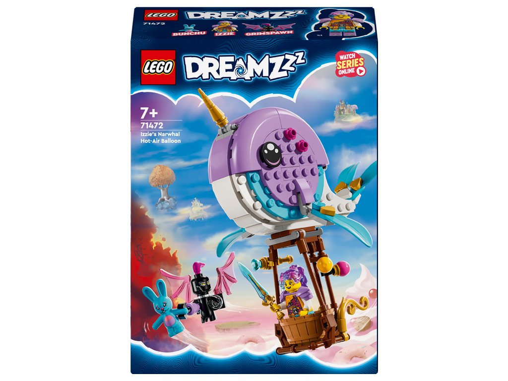 Deti od 7 rokov sa môžu ponoriť do fantastického sveta LEGO® DREAMZzz™ s hračkou Izzie a jej teplovzdušný balón v tvare narvala (71472). Táto stavebnica na motív napínavého televízneho seriálu umožňuje deťom pomôcť postavičkám hrdiniek LEGO DREAMZzzIzzie zachrániť svoje hračkárske zvieratko, zajačika Bunchu, zo zajatia zloducha z nočnej mory tým, že postavia fantazijnú hračku v podobe veľryby.Táto parádna hračka LEGO so zvieratami podnecuje deti k vymýšľaniu vlastných dobrodružstiev a rozvíjaniufantázie tým, že majú na výber 2 možnosti stavania. Model obsahuje množstvo funkcií vrátane otváracej tlamy a jedného priestoru vo vnútri na malé predmety, ako sú ozdobné diely a balóny. Deti potom môžu model hlbokomorského zvieraťa premeniť na hračkársky teplovzdušný balón alebo na rýchly a obratný čln.Stavebnicu oživujú postavičky LEGO DREAMZzz vrátane hrdinky Izzie a Škodlivky. Balenie obsahuje aj malú figúrku zajačika Bunchu, takže deti môžu prežiť celý príbeh a vytvoriť si vlastné stavby snov.