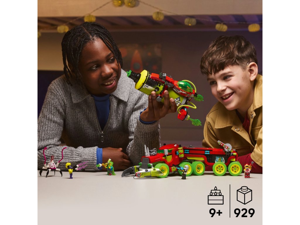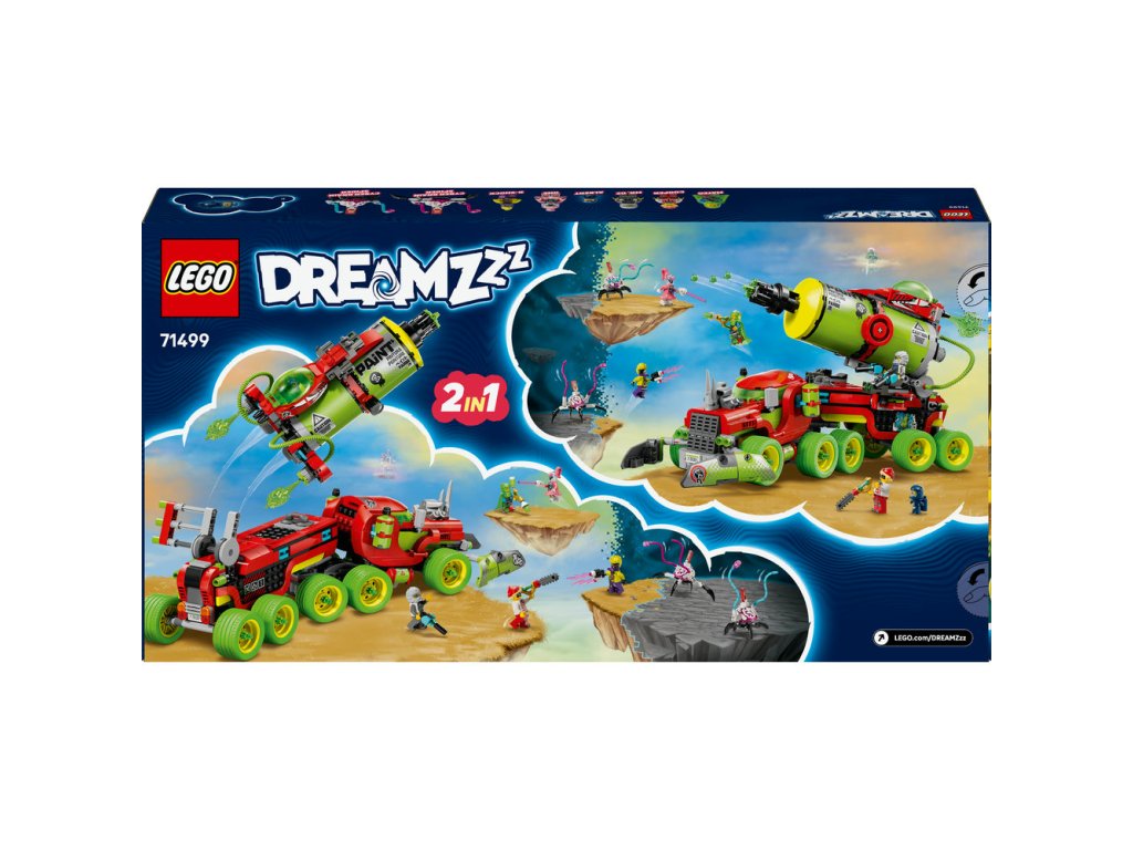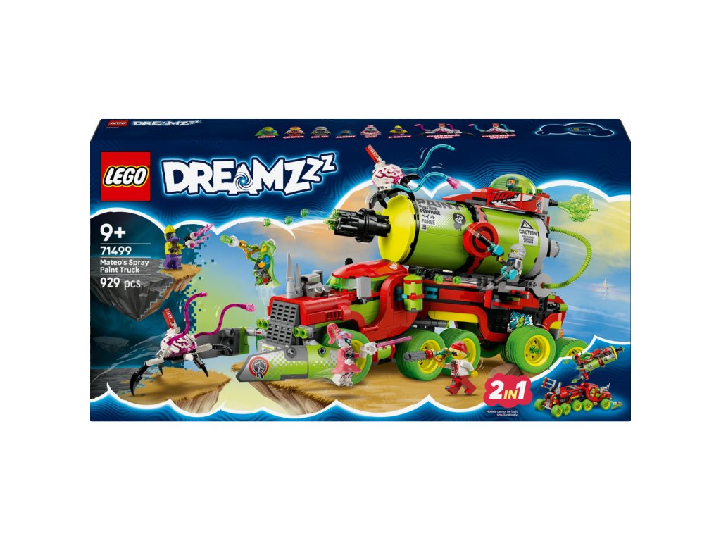 Fanúšikovia LEGO DREAMZzz si užijú kopu zábavy počas stavania nákladného auta, ktoré potom premenia na podobu obrovskej farby v spreji alebo na raketomet v podobe spreja. Medzi parádne detaily modelu patria vystreľovače projektilov, otvárací kokpit a modulárne vystreľovače a spreje, ktoré sú kompatibilné s ostatnými stavebnicami zo série LEGO DREAMZzz z roku 2025 (predávané samostatne). Stavebnica obsahuje aj Matea, Coopera, pána Oza, Alberta, Onea, D-Shocka a 2 Kybermozgových pavúkov, s ktorými si deti užijú tvorivé hry na postavy.
