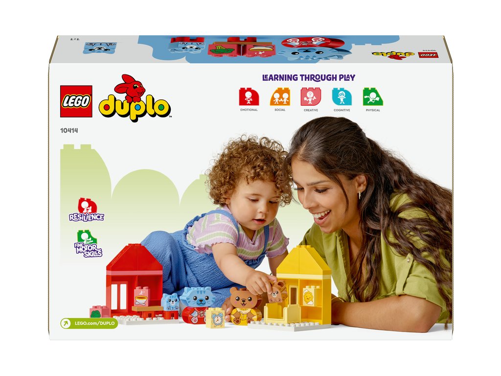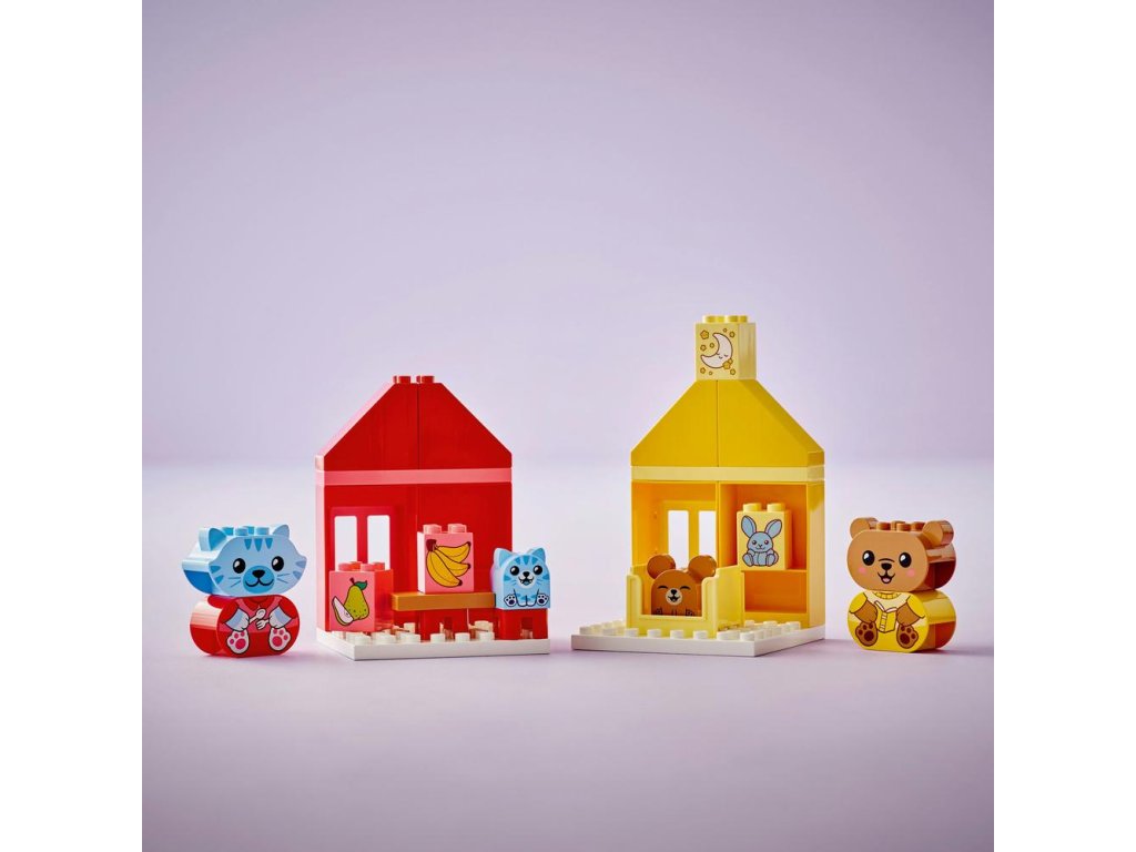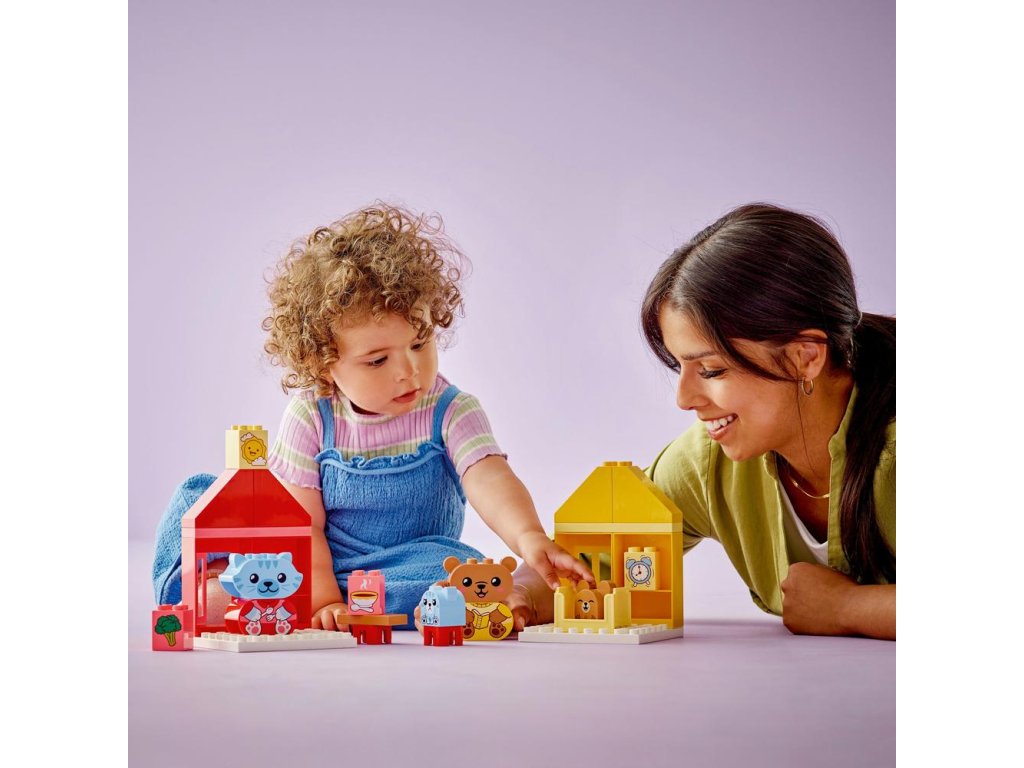 Stavebnice LEGO DUPLO sú skvelým spôsobom, ako sa učiť hrou. Okrem zábavnej a interaktívnej hry na postavy môžu rodičia pomocou hračkárskych figúrok vysvetliť batoľatám dôležitosť každodenných rituálov. Deti si zlepšujú jemnú motoriku popri zostavovaní farebných kociek na model 2 domčekov. Každá aktivita je farebne označená, aby bolo stavanie hračkou.