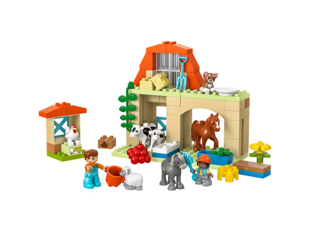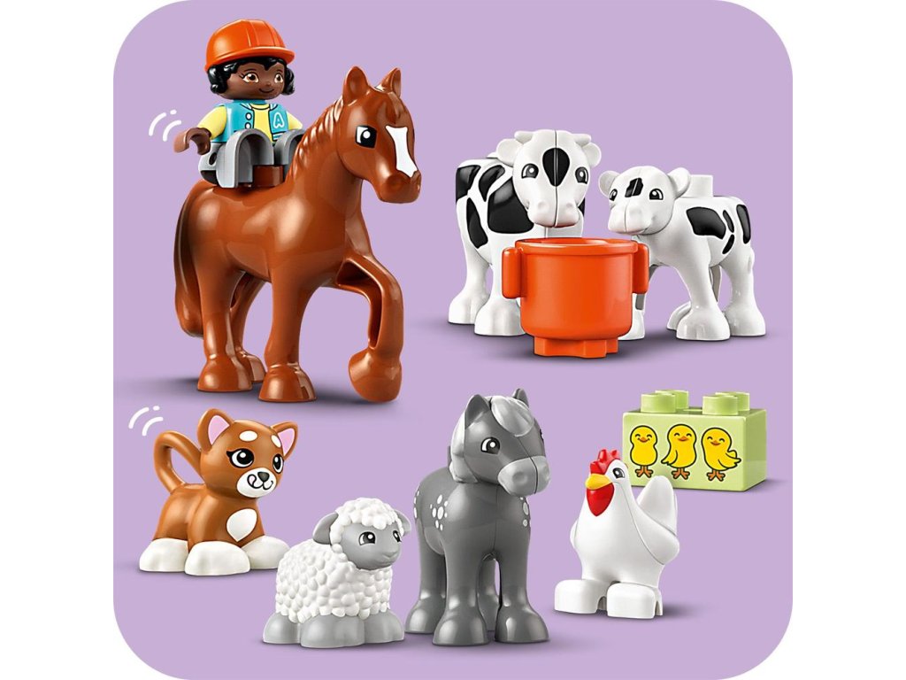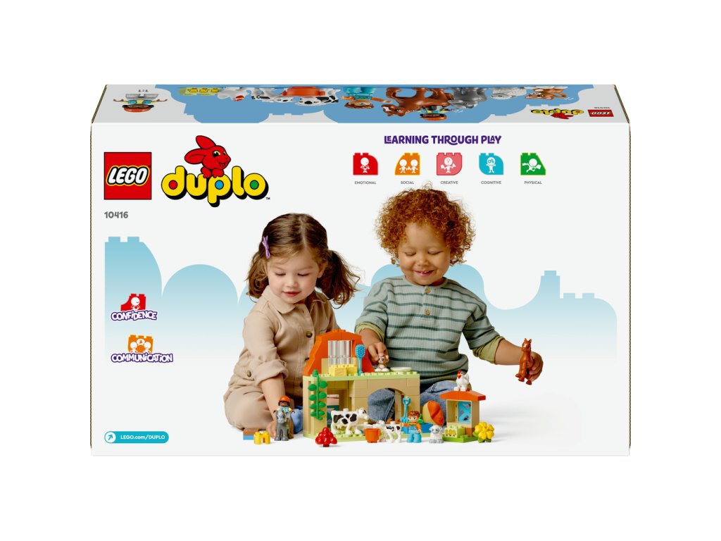 Máte doma dieťa, ktoré miluje farmárske stavebnice? Model Starostlivosť o zvieratká na farme (10416) je ideálnym darčekom pre každého malého milovníka zvierat. Táto vzdelávacia hračka pre deti od 2 rokov obsahuje 8 LEGO® DUPLO® figúrok zvierat vrátane koní, oviec, kráv a sliepok a poteší každé batoľa, ktoré miluje hru na skutočné úlohy a spoznávanie nových kamarátov na farme.
