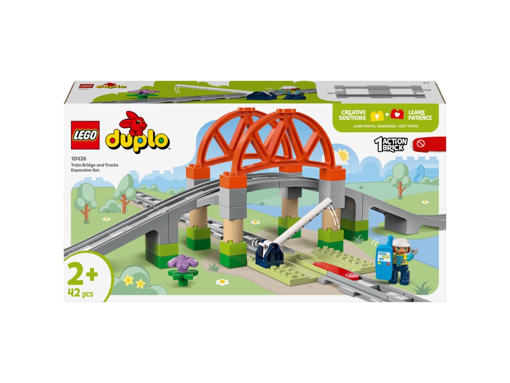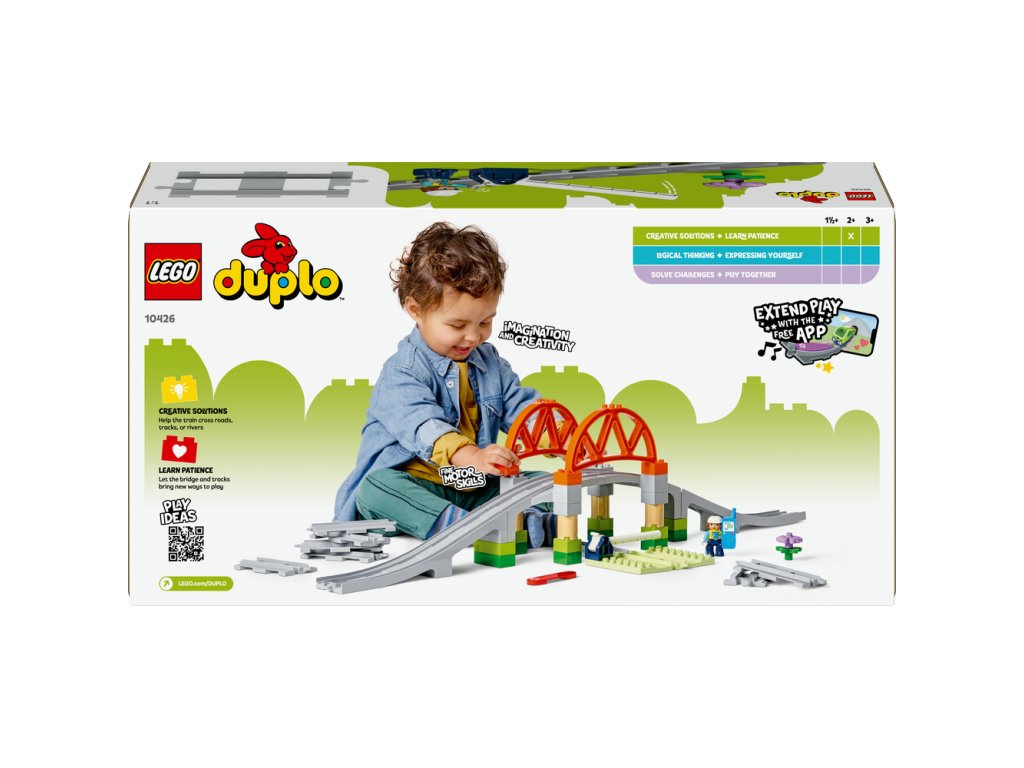 Vezmite hru vášho drobca s vláčikmi na vyššiu úroveň s rozširujúcou sadou Železničný most a koľajnice (10426). Táto kreatívna hračka na stavanie a prestavovanie umožňuje batoľatám pridať vyvýšený most k ich interaktívnym vláčikom zo série LEGO® DUPLO® Mesto (10427 a 10428, predávané samostatne) a predĺžiť trasu pomocou 8 rovných dielikov koľají, ktoré možno pripojiť k akejkoľvek vlakovej stavebnici LEGO DUPLO. Súčasťou modelu je aj zostaviteľný most a zdvíhacia zábrana. Deti od 2 rokov si užijúveľa zábavy pri hre na inžinierov púšťajúcich vlak a zároveň si precvičia jemnú motoriku. Vďaka akčnej kocke sa interaktívne vláčiky zo stavebníc 10427 a 10428 v jej blízkosti zastavia a zahrajú zábavné zvuky.
