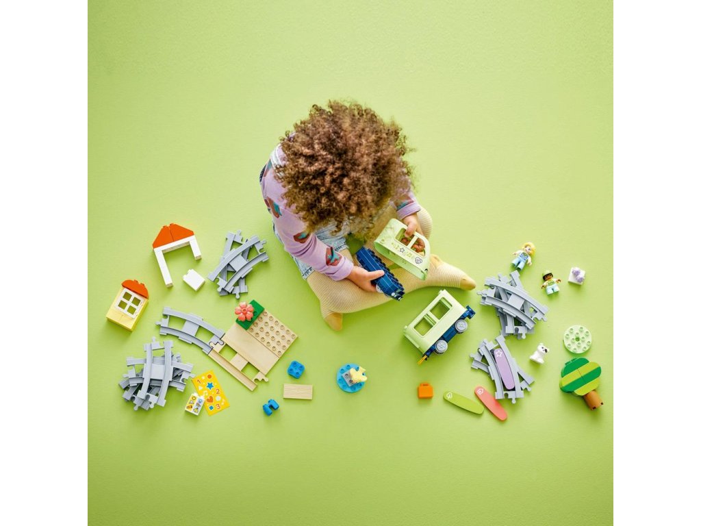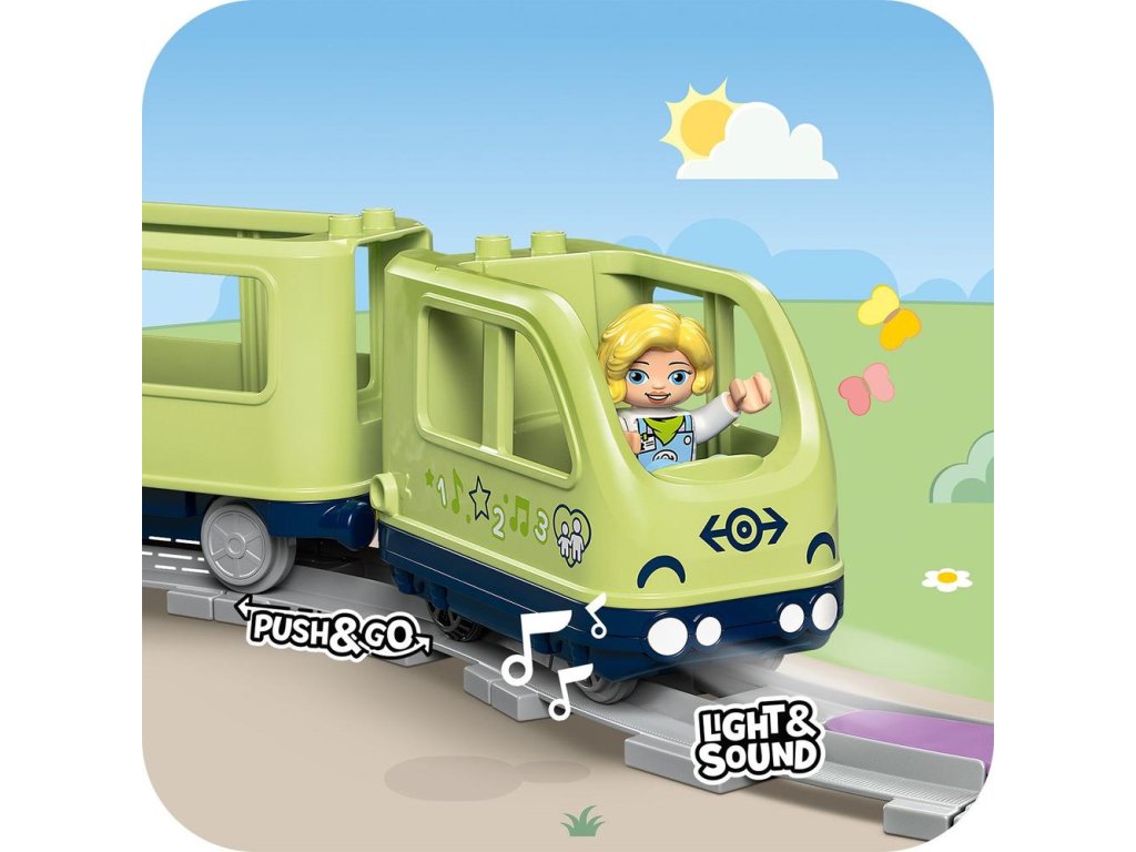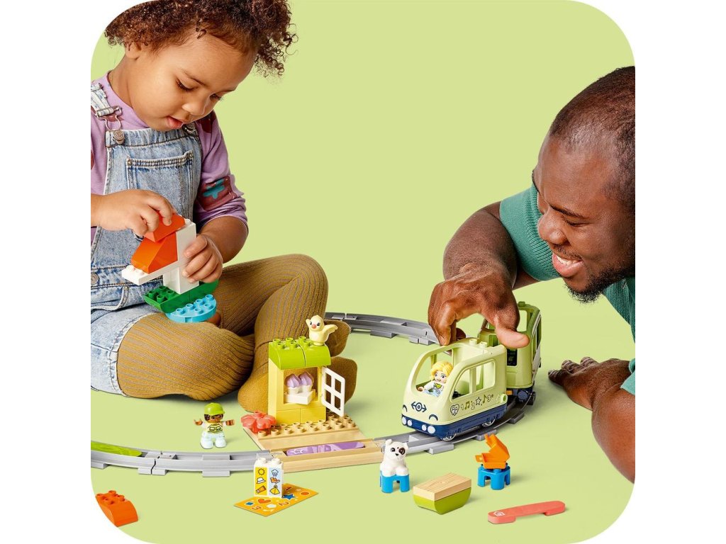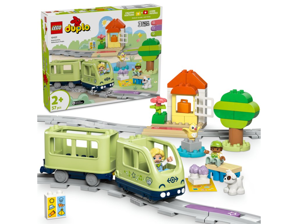 3 akčné kocky oživujú hru, pretože hračkársky vláčik vďaka nim vydá realistické zvuky zakaždým, keď po nich prejde. Deti si tak precvičia predvídavosť popri hádaní, o ktorý zvuk pôjde. Pomocou špeciálnej prispôsobiteľnej kocky môžu tiež prehrávať vlastné zvuky, ktoré nahrajú v bezplatnej aplikácii LEGO® DUPLO® Interaktívne vláčiky, ktorá im tiež umožňuje riadiť vláčik pomocou prenosného elektronického zariadenia.