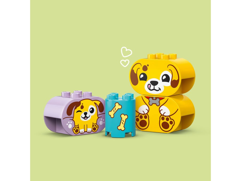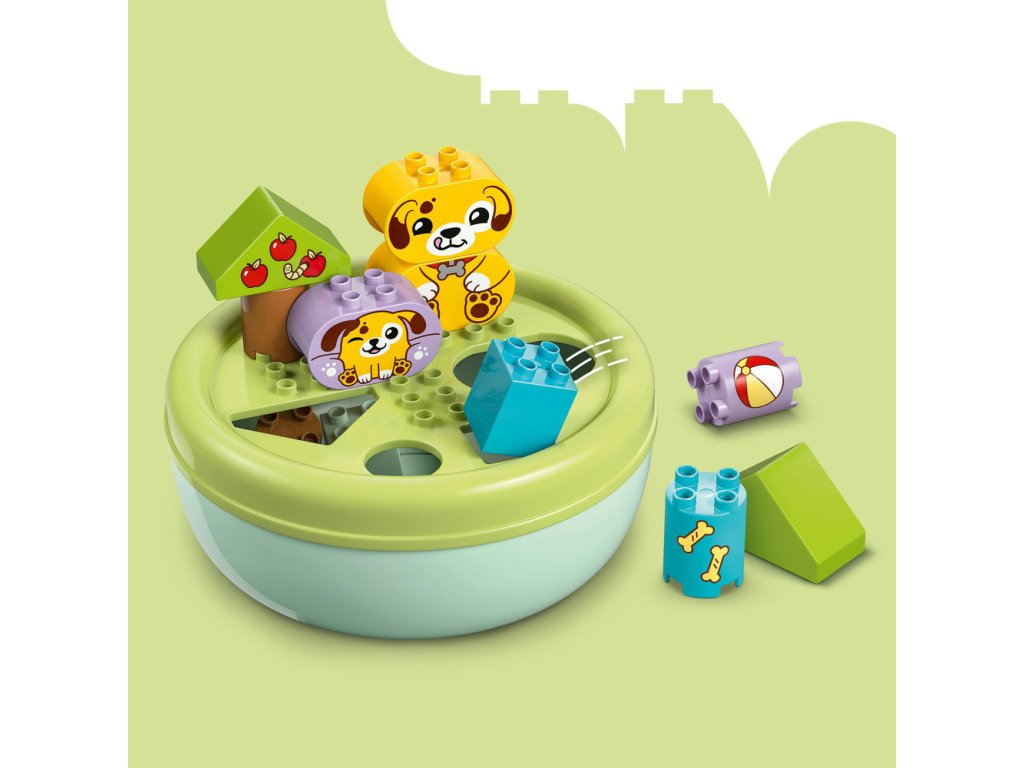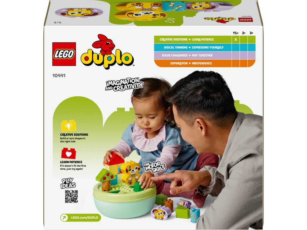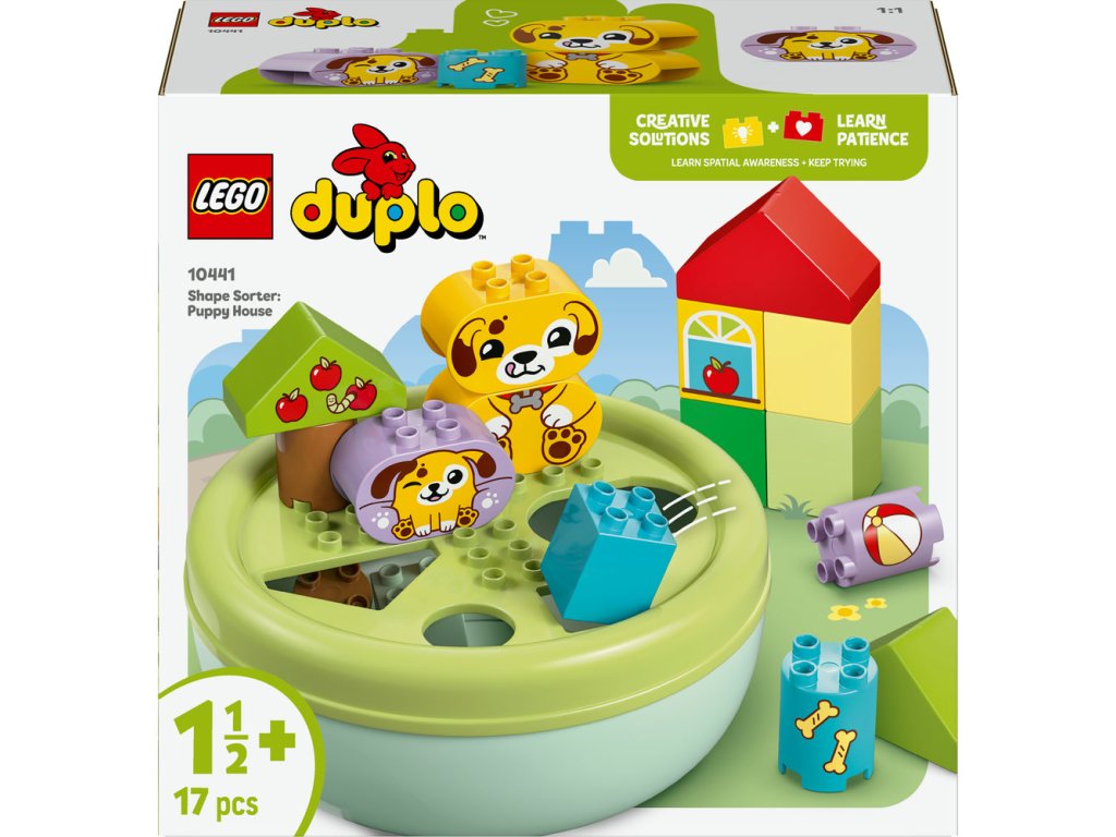 Malých milovníkov šteniatok čakajú dva zábavné spôsoby, ako sa hrať so stavebnicou Triedenie tvarov: Domček pre šteniatka (10441). Táto hračka pre batoľatá od 18 mesiacov podporuje vývoj zručnosti jemnej motoriky zábavnou farbou a deti skúmajú nové tvary a učia sa riešiť problémy, keď s kockami stavajú miesto na hranie pre šteniatka a potom triedia kocky rôznych tvarov do otvorov vo veku misky. Táto hračka podporuje priestorové myslenie batoliat a je plná zábavných aktivít pre celú rodinu. Rodičia môžu deťom ukázať všetky rôzne tvary v balení, ktoré potom batoľatá použijú na stavbu stromov, figúrok psíkov a dokonca aj domčeka a potom si užijú tvorivé hry so svojimi roztomilými hračkárskymi psíkmi LEGO® DUPLO®, kotúľajú im loptu a kŕmia ich kosťou.