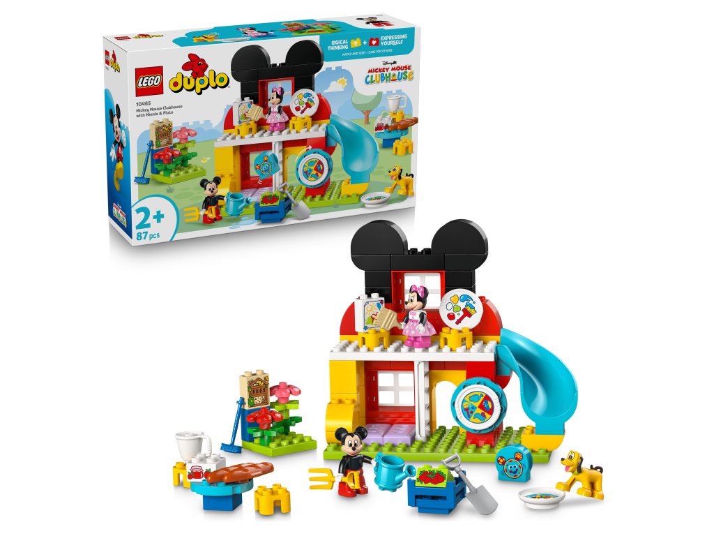 Batoľatá od 2 rokov sa môžu pridať k obľúbeným postavičkám od Disney a plniť zábavné úlohy so stavebnicou Mickey Mouseov klub s Minnie a Plutom (10465). V stavebnici nájdete 2-poschodový domček so šmykľavkou, umeleckou miestnosťou, záhradkou s hmyzím hotelom, stolmi a stoličkami a špeciálnymi dvierkami pre Pluta. Nechýbajú postavičky LEGO ǀ Disney Mickey Mousea, Myšky Minnie a Pluta, ako aj kocka s obrázkom superpočítača Toodlesa. Batoľatá môžu najprv roztočiť koliesko superpočítača a rozhodnúť, či majú postavičky nakŕmiť Pluta, okopávať záhradu, maľovať obrázok alebo sa pohrať na šmykľavke. Okrem toho sa môžu ponoriť do nekonečných hier pri skúmaní prvkov tejto stavebnice. Môžu si predstaviť, že pestujú jahody alebo vyrábajú džem na raňajky. Stavebnicová hračka Disney im pomôže precvičiť jemné motorické zručnosti, keď vkladajú nástroje do rúk postavičiek. Vzdelávacia stavebnica pre batoľatá môže podporiť malých chlapcov a dievčatá, aby sa starali o ostatných, keď kŕmia Pluta alebo pripravujú raňajky pre kamarátov. Stavebnica obsahuje 87 dielikov.