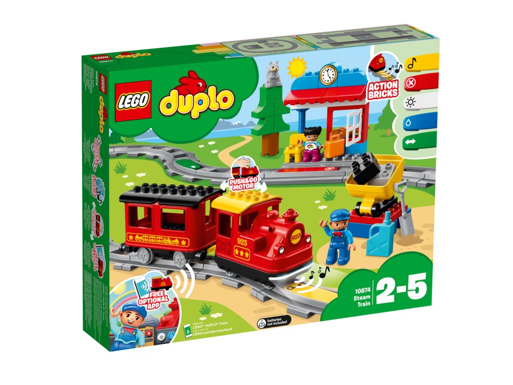 LEGO® DUPLO® 10874 Parný vlak môže vaše dieťa teraz ešte jednoduchšie ovládať a hrať sa s ním viacerými spôsobmi. Vďaka motoru Push & Go sa môžu malé deti stať rušňovodičmi. Stačí jemne potlačiť vlak dopredu alebo dozadu a vydá sa na cestu. Zastaví sa, keď ho zatlačia nadol alebo zdvihnú z koľajníc. Pomôžte im umiestniť 5 farebných akčných kociek na trať, aby vlak zatrúbil, zapol a vypol svetlá, prerušil jazdu a doplnil palivo, zmenil smer a zastavil tam, kde chcú ony. Táto stavebnica LEGO DUPLO obsahuje navyše vlakovú stanicu, sklápač na uhlie, 2 DUPLO figúrky a figúrku zvieraťa a jednoduchú trať pre hračkársky vlak. Predškoláci si tak môžu užívať klasickú zábavnú hru s vlakom. Stiahnite si voliteľnú aplikáciu a objavte ďalšie herné možnosti vrátane funkcie diaľkového ovládania a zábavných aktivít pre deti!
