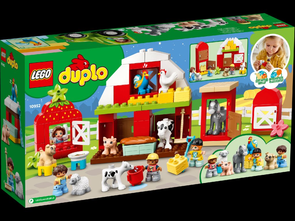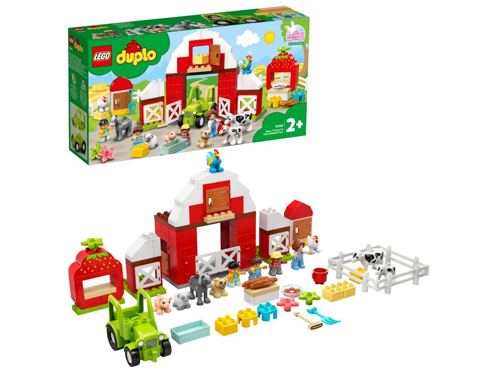 Stavebnica LEGO® DUPLO® Stodola, traktor a zvieratká z farmy (10952) je plná možností na hranie a vzdelávanie pre batoľatá, ktoré majú rady zvieratká a farmárske vozidlá. Stavebnica obsahuje prasiatko, ovečku, koníka, psíka, sliepočku, kohúta, 2 kravičky, 4 figúrky zo série LEGO® DUPLO®, stodolu, balík slamy s realistickou textúrou a kopu parádnych doplnkov. Pri aktivitách na farme, ako je napríklad kŕmenie zvieratiek alebo jazdenie na koníkovi, si deti budú rozvíjať jemnú motoriku a budovať sociálny či emočný rozsah. Ide o skvelý darček na Vianoce, sviatky, narodeniny alebo „len tak“ pre malých farmárov vo veku od 2 rokov, ktorí majú radi zvieratká, obľubujú traktory alebo sú skrátka zvedavé. Stodola meria vyše 23 cm na výšku, 20 cm na šírku a 11 cm do hĺbky. Táto univerzálna stavebnica sa dá rôzne prestavovať a kombinovať so všetkými ostatnými hračkami zo série LEGO® DUPLO® Farma. Návod na stavanie obsahuje zábavný obrázkový príbeh, v ktorom figurujú modely zo stavebnice a ktorý obohacuje zážitky zo stavania a tvorivé hry o ďalší zábavný rozmer. Všetky stavebnice LEGO® DUPLO® sú vytvorené špeciálne pre batoľatá a obsahujú prvky, ktoré nabádajú k nekonečným hrám na rozvoj schopností pre rodičov a ich ratolesti. Stavebnice LEGO® DUPLO® spĺňajú prísne normy kvality v odvetví, vďaka čomu môžu drobné pršteky vašich detí kocky ľahko dvíhať, skladať a oddeľovať.