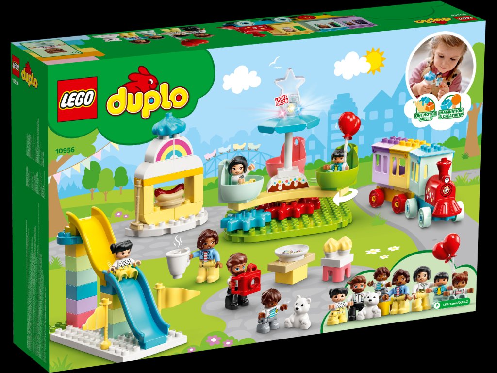 - Stavebnica LEGO® DUPLO® Mesto: Zábavný park (10956) je plná úžasných atrakcií, praktických prvkov a zábavy pre celú rodinu, ktoré zaujmú, zabavia a podnietia fantáziu v malých hlavičkách.