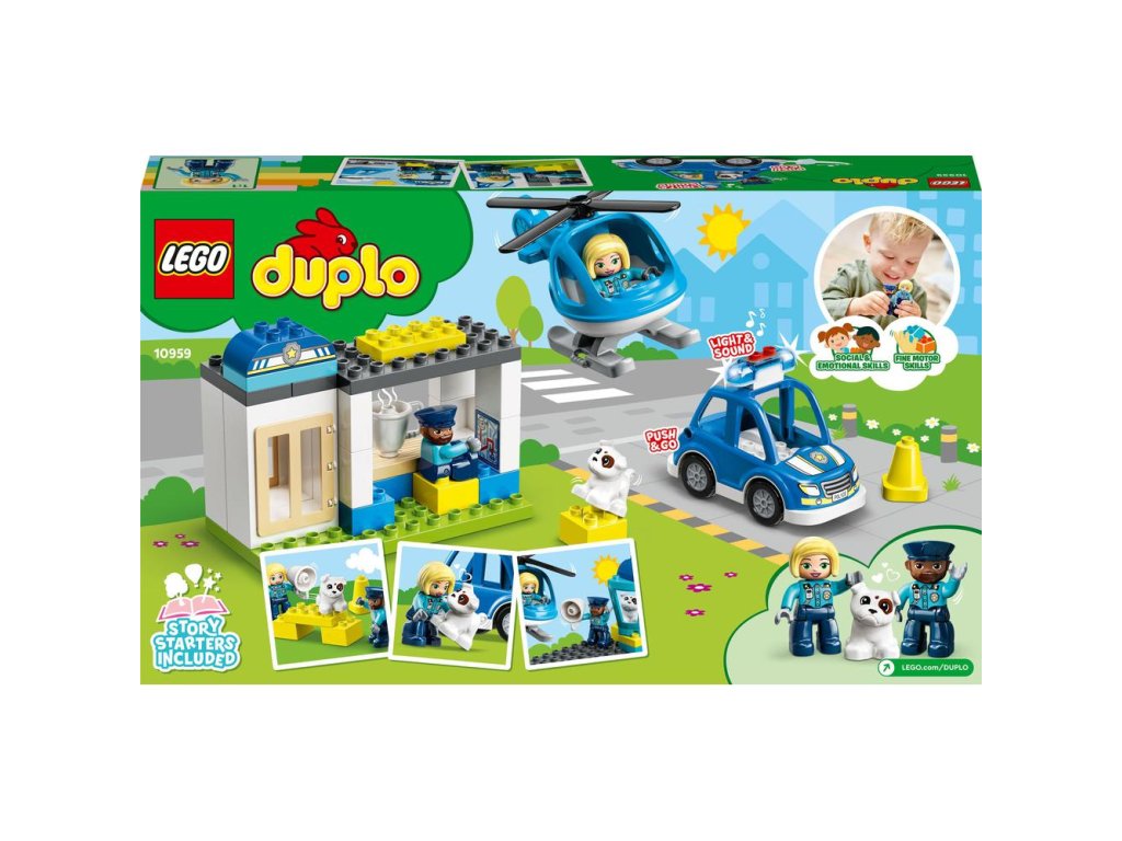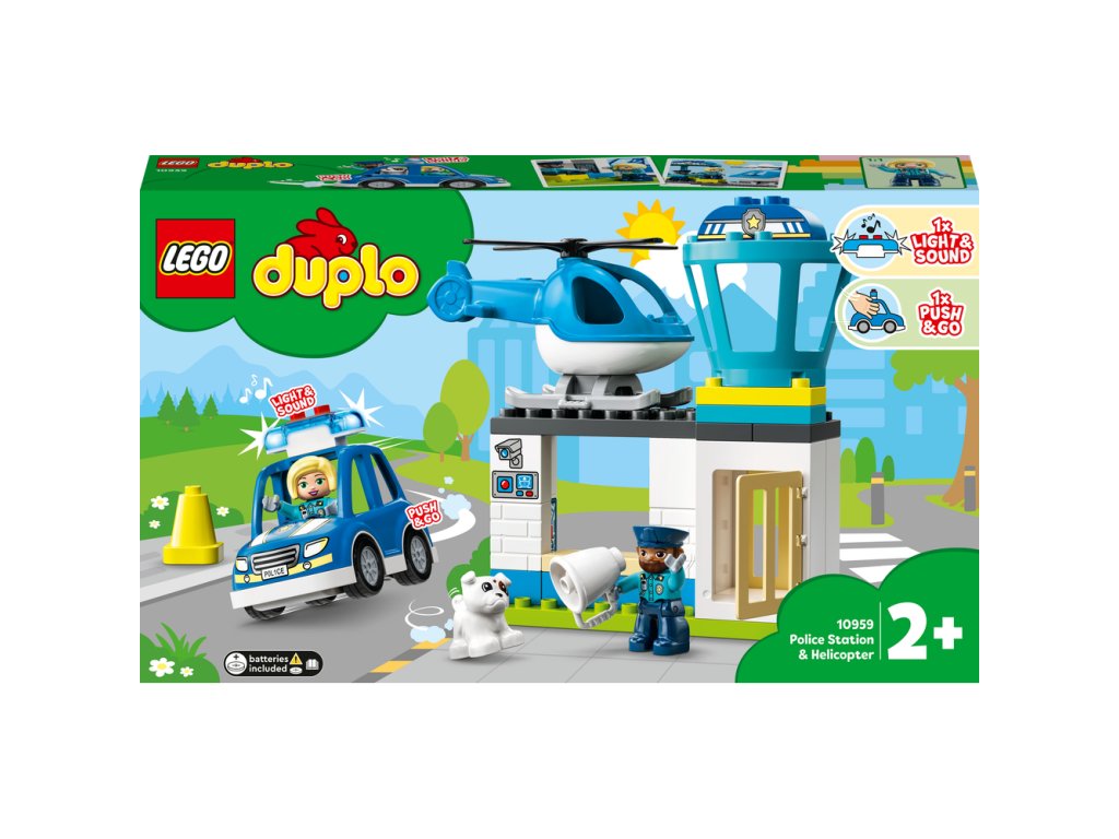 LEGO® DUPLO® (10959) Policajná stanica a vrtuľník je policajný set pre najmenších plný postáv a vozidiel, ktoré deťom od 2 rokov ponúkajú hravú inšpiráciu. Hra plná rozvoja na policajnej stanici V policajnej stanici to žije zábavou! Nájdete v nej policajné auto s technológiou Push&Go, blikajúcimi svetlami a sirénou (batérie sú súčasťou balenia), rozkošného psíka, ktorého si môžete vycvičiť, a rozhľadňu, odkiaľ môžu policajní strážnici sledovať policajný vrtuľník s otáčavými čepeľami rotora. Počas stavania a hier si budú deti cibriť jemnú motoriku, emocionálne vnímanie a mnoho iných zručností. A keďže majú akciu vždy vo svojich rukách, bez starostí sa môžu naučiť všetko o práci policajtov. Škola hrou pre najmenších Hračky LEGO DUPLO deťom vkladajú do rúk zábavu bez hraníc, možnosti sebavyjadrenia a hravého skúmania. Rodičia tak môžu so svojimi najmenšími prežívať vzácne míľniky vo